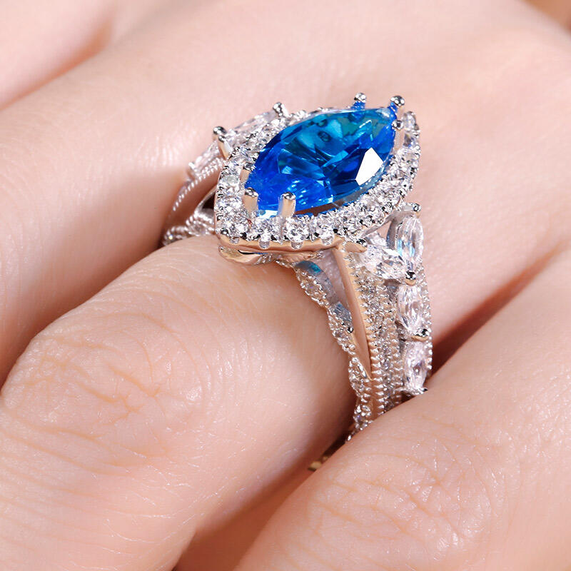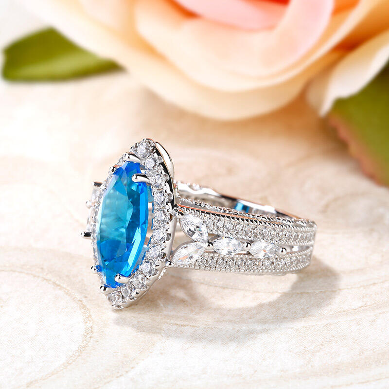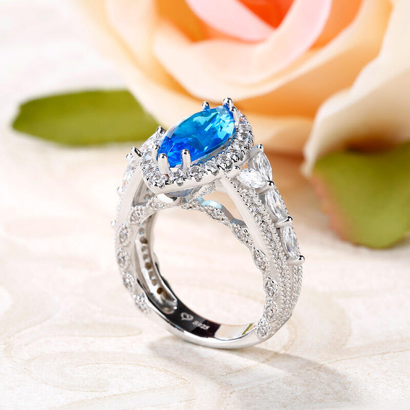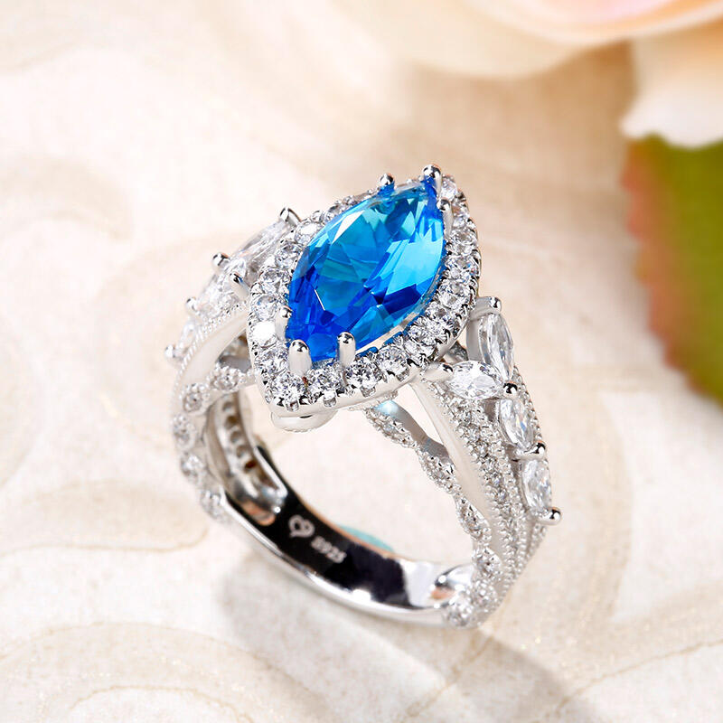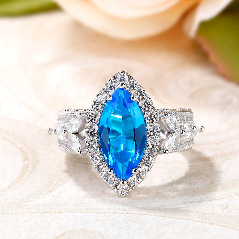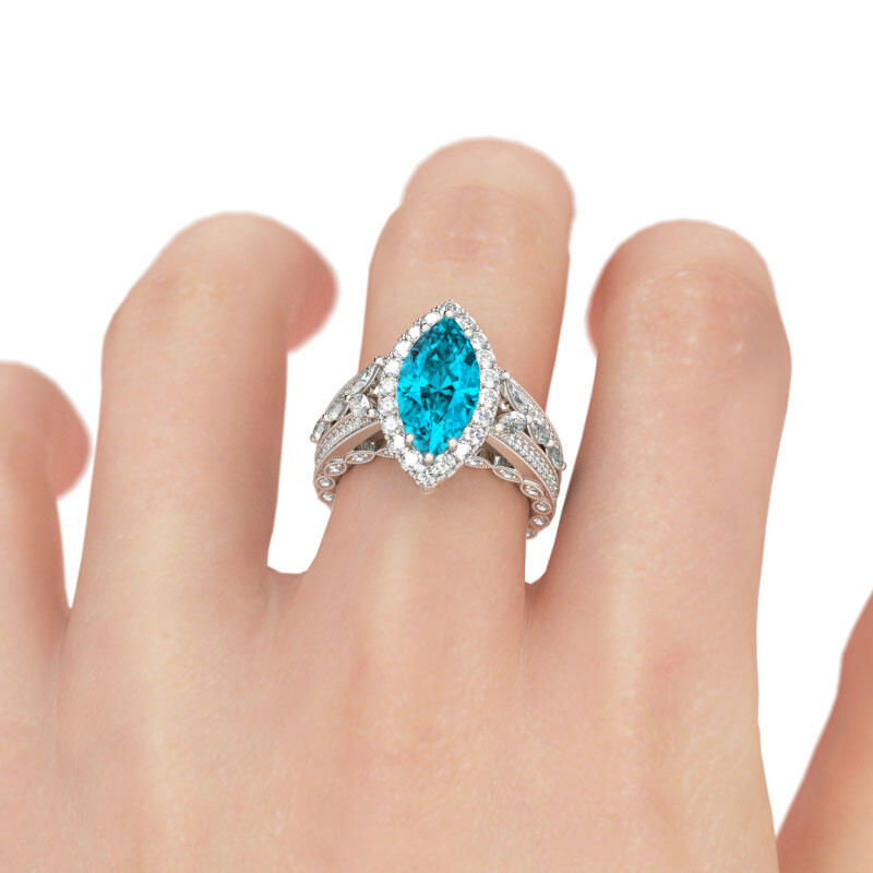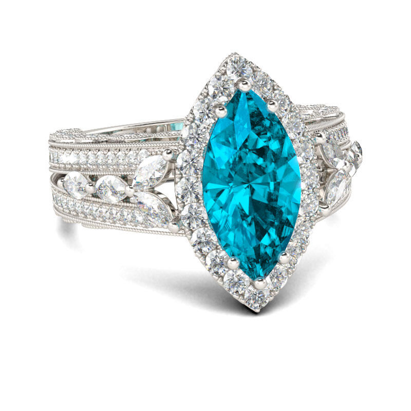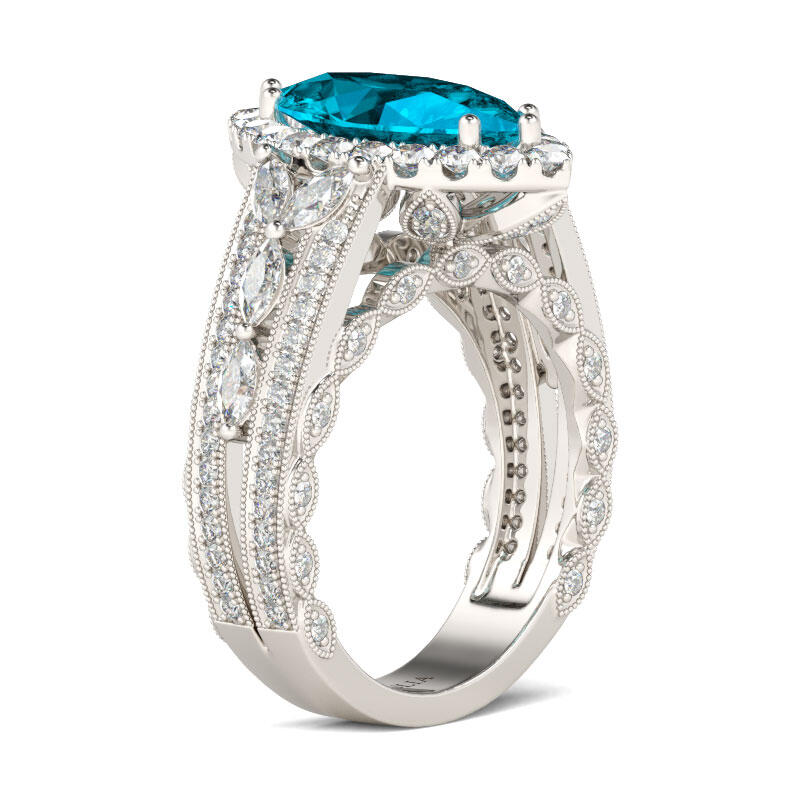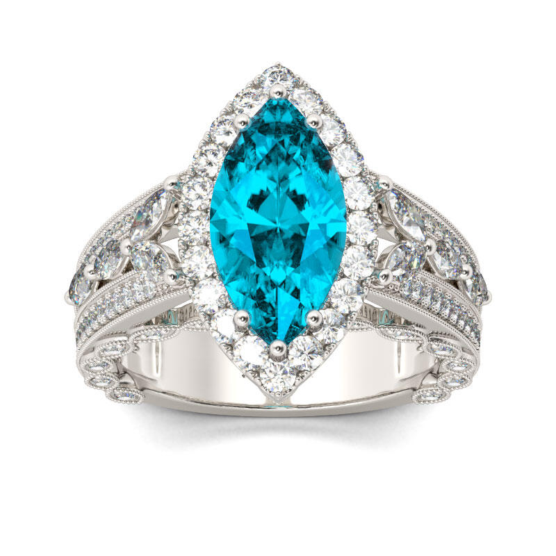 Stunning and breathtaking, this ring will capture your heart at first sight. Crafted in sterling silver, this engagement ring makes a most charming piece with its marquise-cut aquamarine stone wrapped in a glistening halo of round stone. Shimmering white stones and vintage-inspired detailing adorns the split shank in three sides, creating a sparkling and exquisite look from every view. Treat yourself or surprised her with this masterpiece!