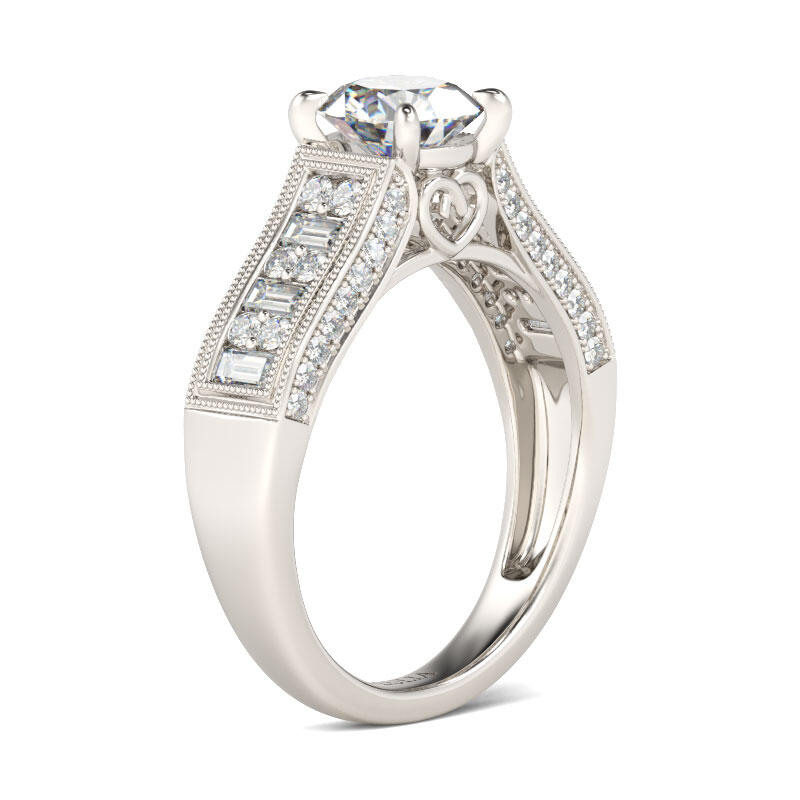 With both style and sparkle to spare, no one will miss this dazzling engagement ring! Fashioned in sterling silver, the engagement ring features a round-cut stone at the center, while the polished shank is dressed with more smaller emerald and round-cut stones. Milgrain detailing along the ring's shank adds depth and dimension to this elegant design.This engagement ring is a beautiful beginning to your romantic love story.