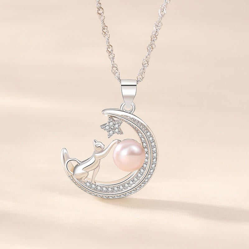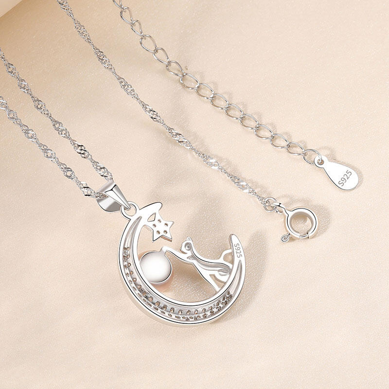 Cat on moon necklace , a lovely cat sitting on the moon represents missing, Love for family and waiting for her families to come home. The cat on the moon can break through the darkness and usher in the dawn. This is a story of a cat and love, cat always means accompany, your loved ones, friends, and families will love this silver cat necklace!