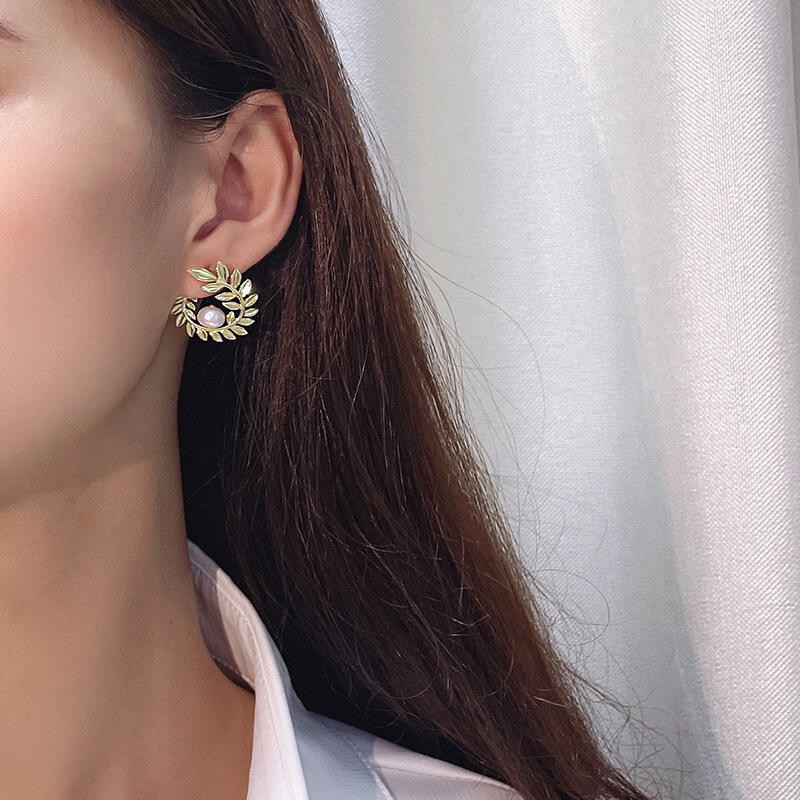 A beautiful tribute to the olive branch, a symbol of peace and abundance. Intricately crafted, these earings feature a large freshwater cultured pearl in the centre surrounded by an olive leaf vine.