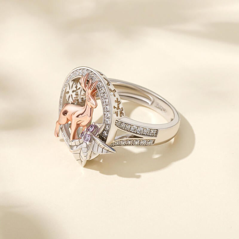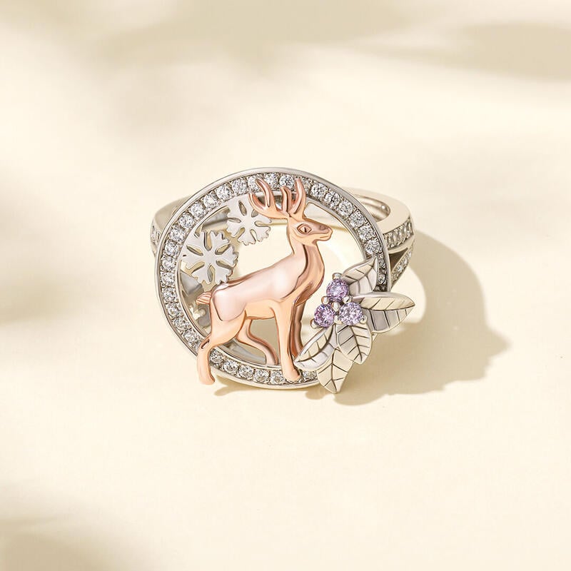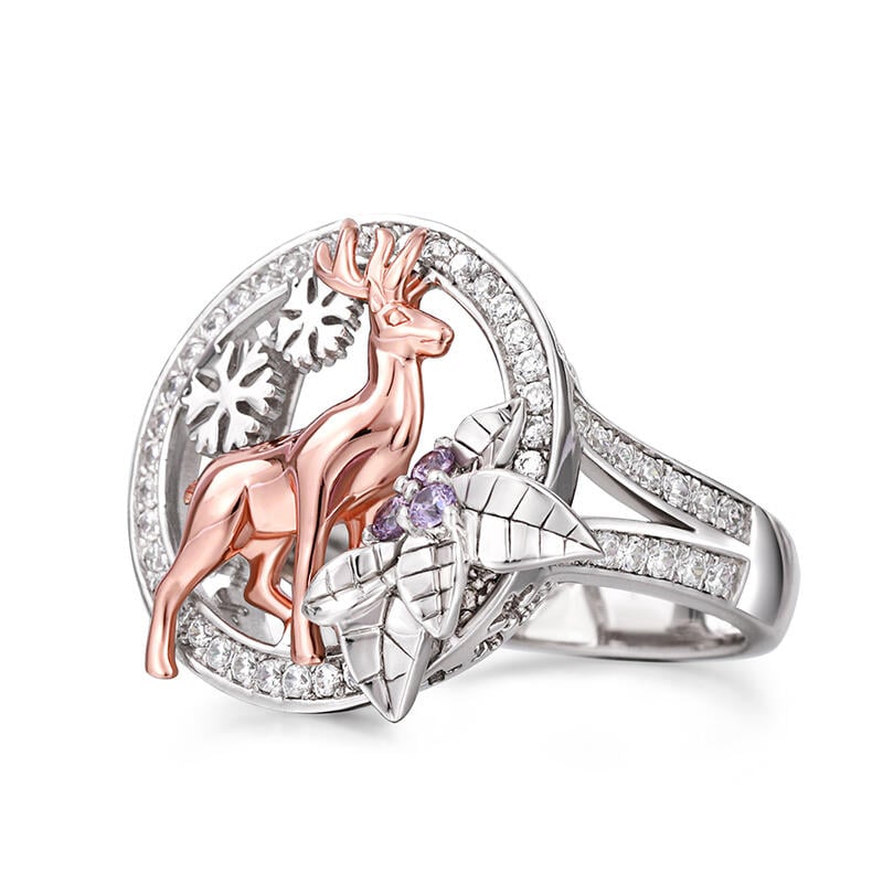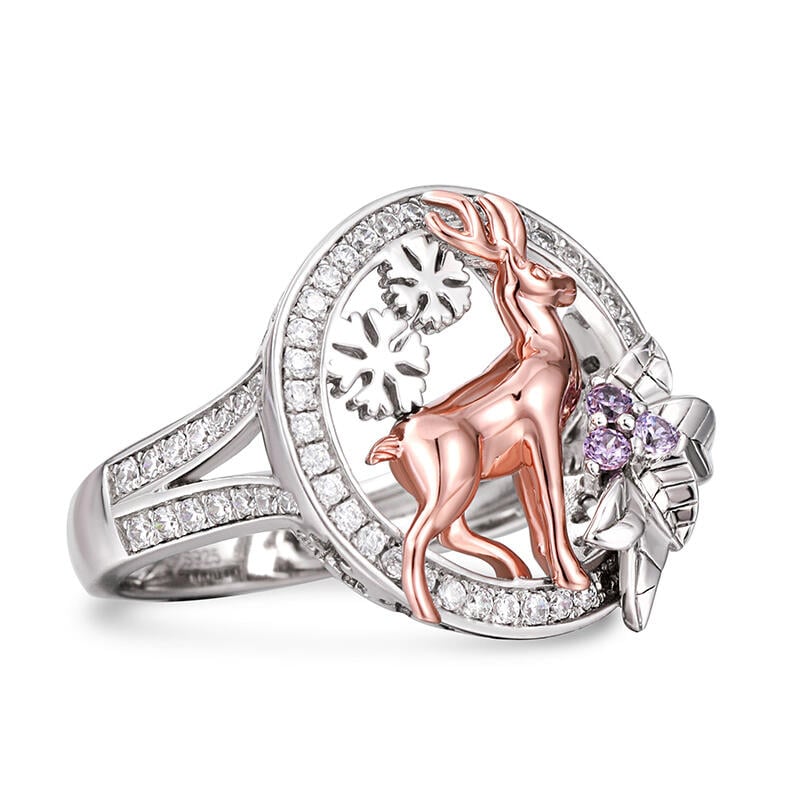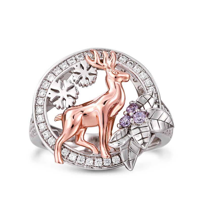 Merry Christmas! Wear this festive reindeer ring for some extra holiday cheer. Beautifully handcrafted in sterling silver, this ring showcases a rose-gold tone reindeer, which is luxuriously haloed by more shimmering stones. Nothing says "winter holiday fun" like our reindeer Christmas ring.