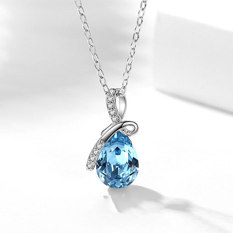 This striking necklace for her features a pendant of twisting sterling silver awash with twinkling round-cut white stones. Poised at the bottom of the pendant is an eye-catching pear-shaped sapphire to complete the look.