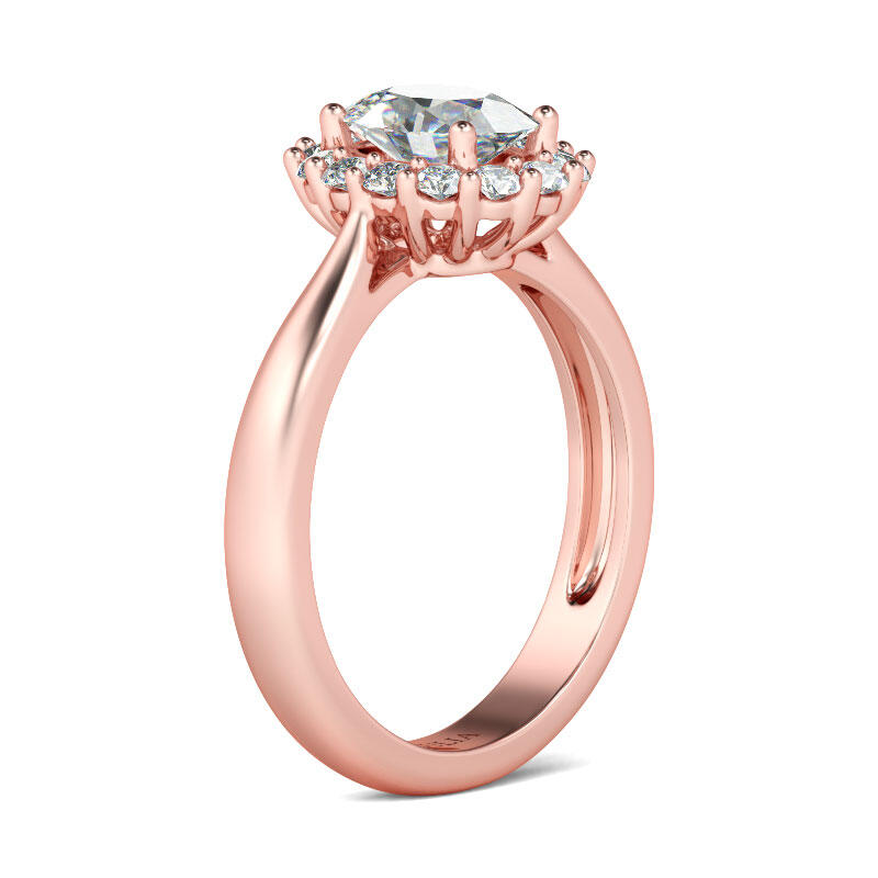 Feminine and elegant, this engagement ring shimmers with all that's lovely about her. Created in rose gold tone sterling silver, this elegant design showcases an oval-shaped center stone and shimmering halo. The high polished shank is a good choice for fans of simple style. Treat yourself with this simple but beautiful piece as a holiday gift.