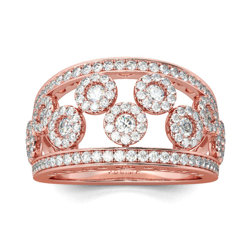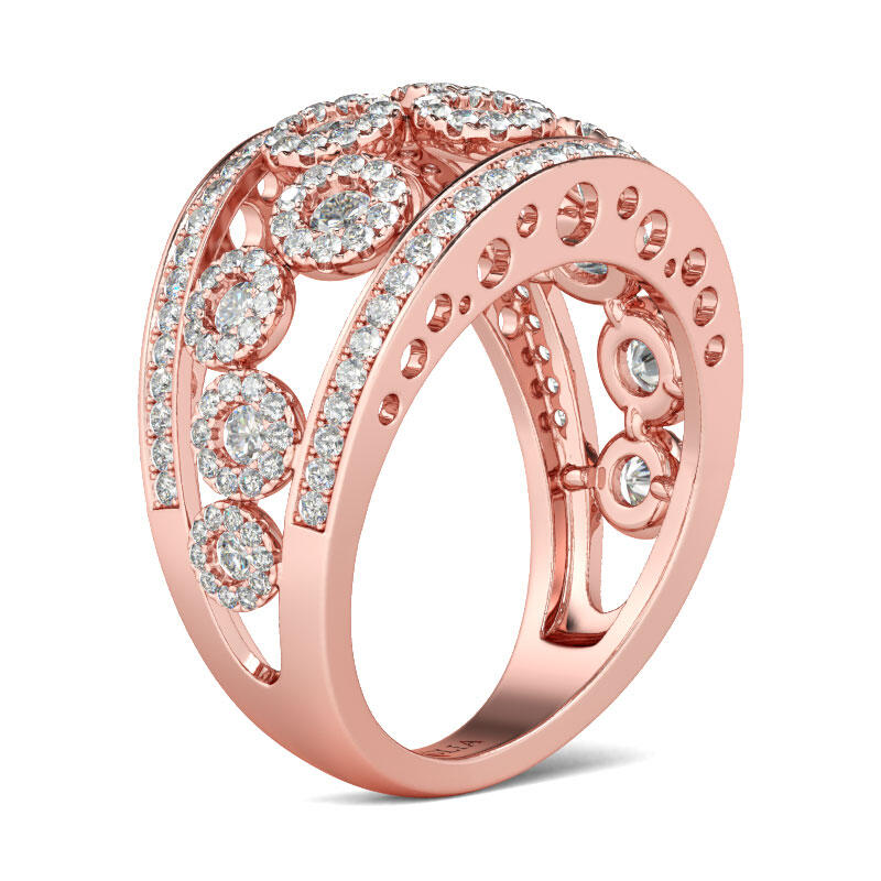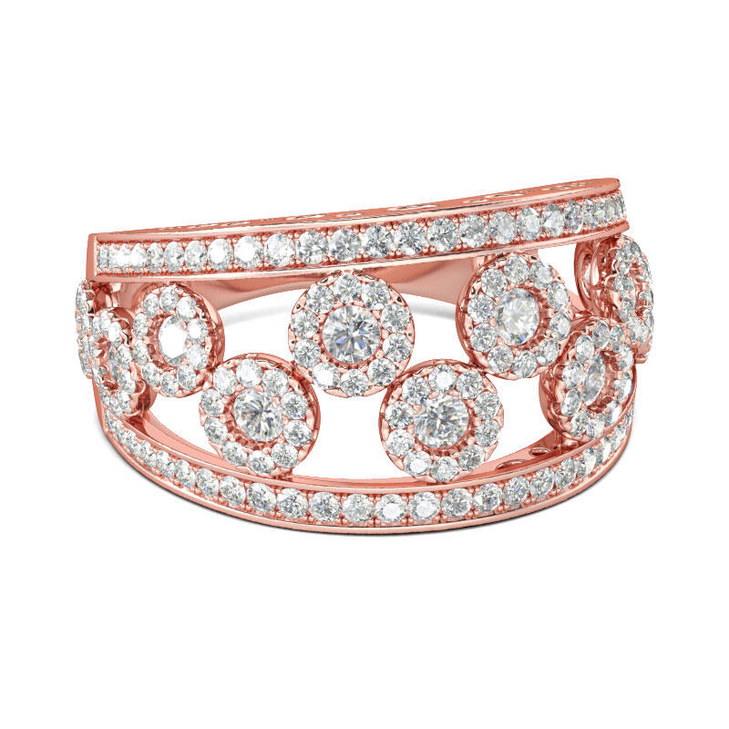 Unique and elegant, this wedding band makes a little lovely gift for loved or yourself. Crafted in rose gold tone sterling silver, the band showcases several shimmering halo frames in the split shank. Along the edge of shank. Glistening round stones are set to add extra sparkle to the band. Treat yourself or surprise her with this dainty piece.