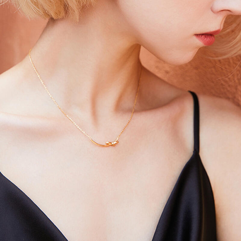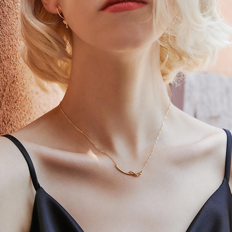 This delicate necklace features a curved bar pendant with a cute and elegant knot design. The necklace is styled in gold-tone 925 sterling silver and has a classic look that will never be out of date.