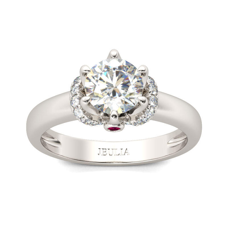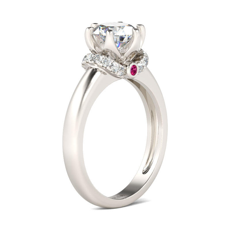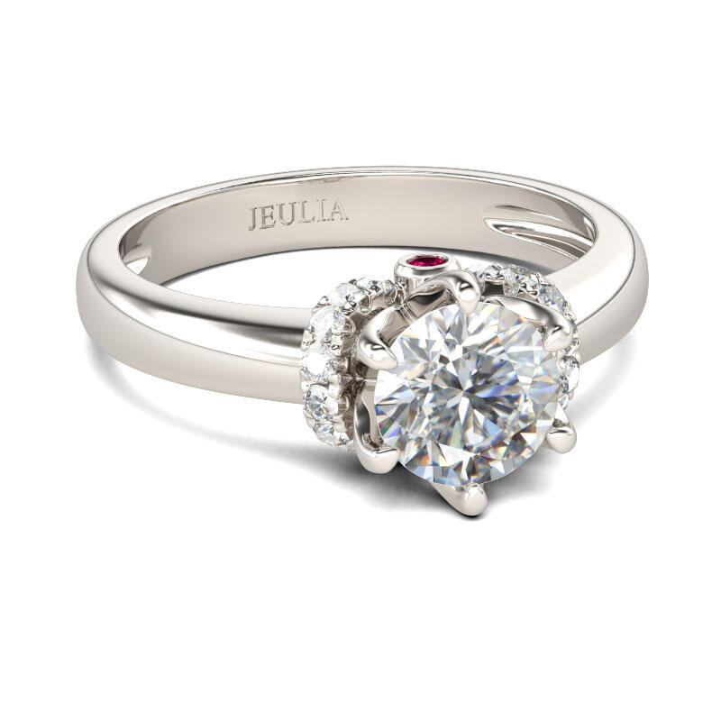 Simple and classic, this engagement ring is the best choice for fans of classic style. Crafted in sterling silver, this impressive design highlights a round-cut center stone in a lovely floral-inspired mount touched by sparkling accents stones. Buffed to a brilliant luster, this engagement ring is destined to delight. Give her a surprise with this masterpiece!