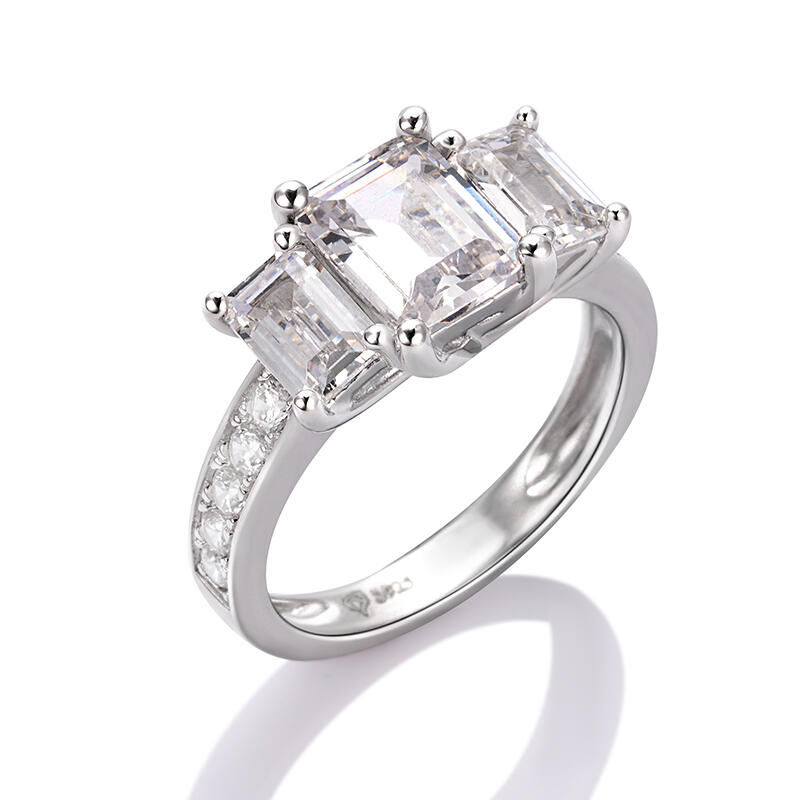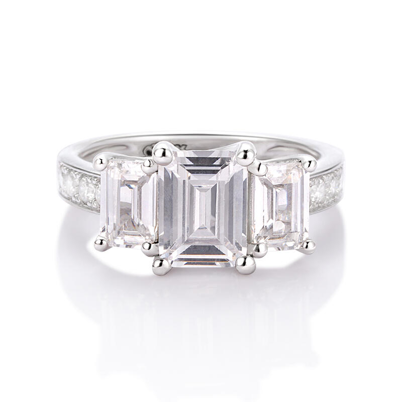 Celebrate your life together with an incredibly stunning three stone ring. Glittering in bold brilliance, three emerald-cut stones shine in prong settings across the top of this sterling silver ring, while smaller round stones adorn the sides of the band. This ring set shimmers with all your beautiful moments to come.
