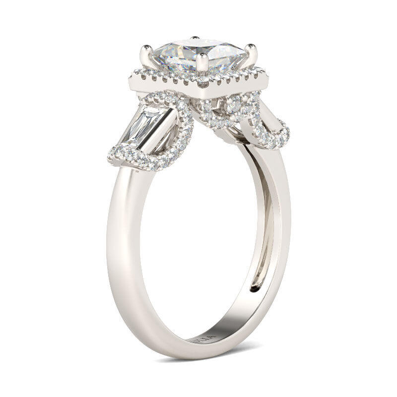 Bold and unique, this halo engagement ring will be an eye-catcher everywhere. Halo design is always popular and in the trend. Crafted in sterling silver, this ring features a princess-cut center stone wrapped in a glistening halo and accented with two tapered baguette-cut stones. Two shimmering ribbons surround the stones to complement the design and add extra sparkle to the ring. This beautiful engagement ring sets the stage for your happily ever after.