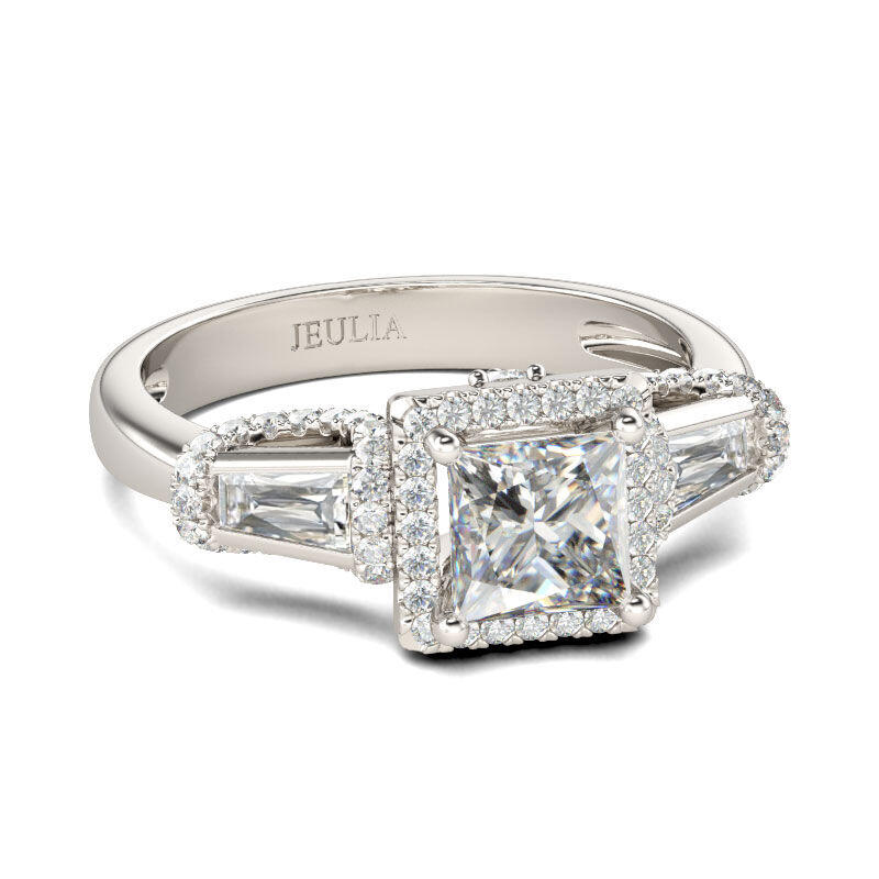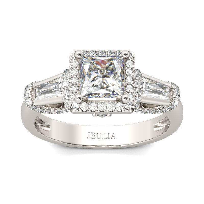 Jeulia Three Stone Halo Princess Cut Sterling Silver Ring