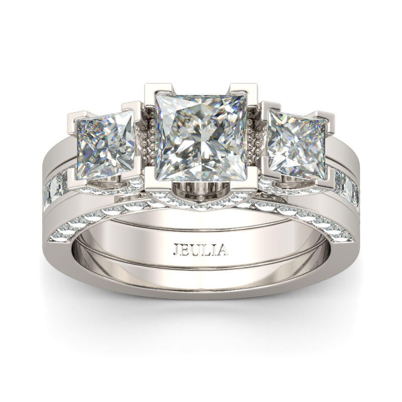 Jeulia Three Stone Interchangeable Princess Cut Sterling Silver Ring Set