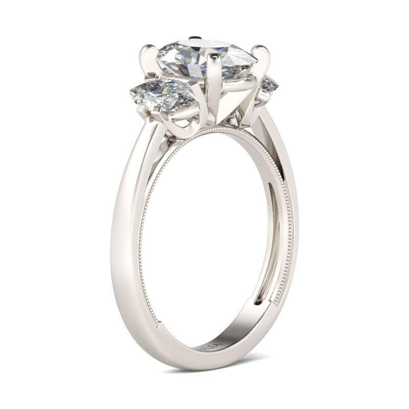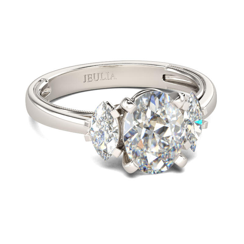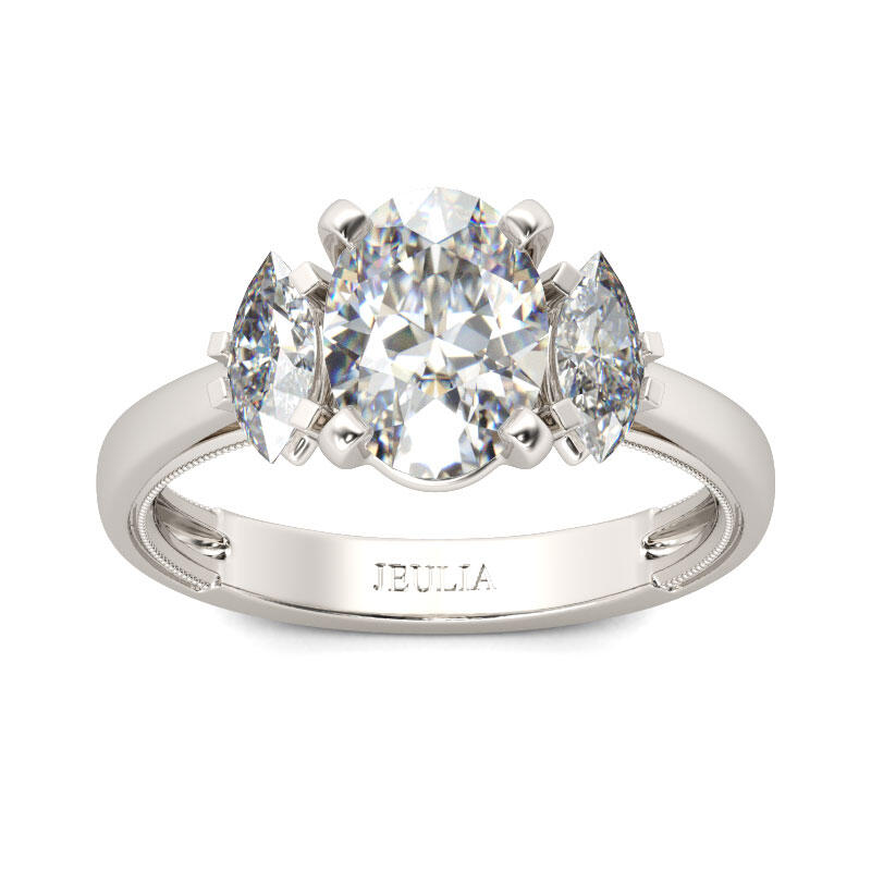Reflect all the love in your heart with this enchanting three stone engagement ring. This design features a sparkling oval cut center stone flanked by two marquise cut stones. All stones shine brightly enough to be deserving as a symbol of your love. Your engagement is one of the most special days of your lives. This exceptional ring makes it that much more memorable.