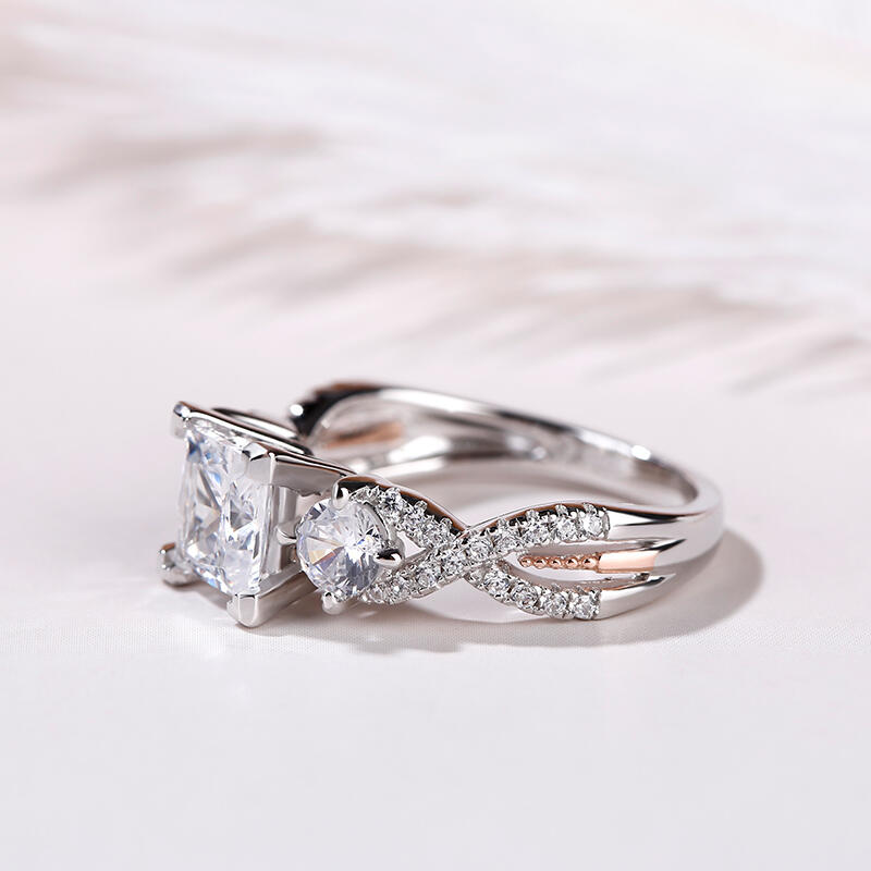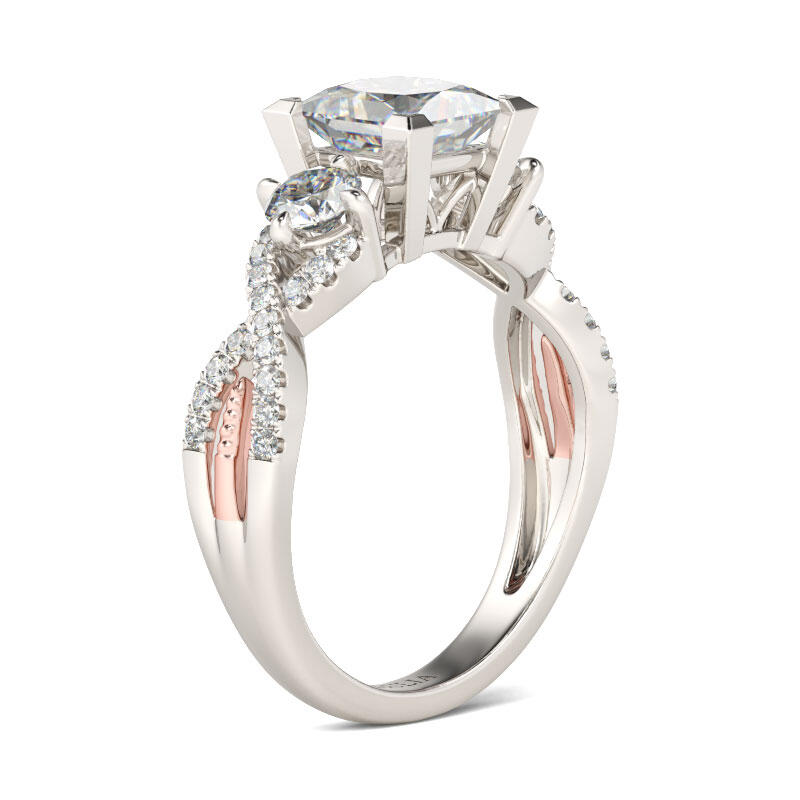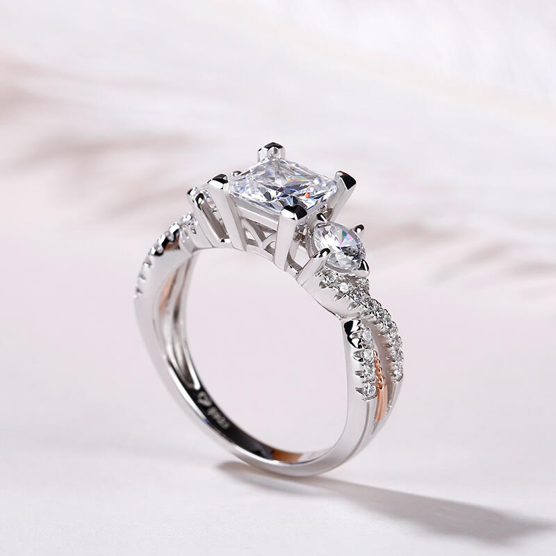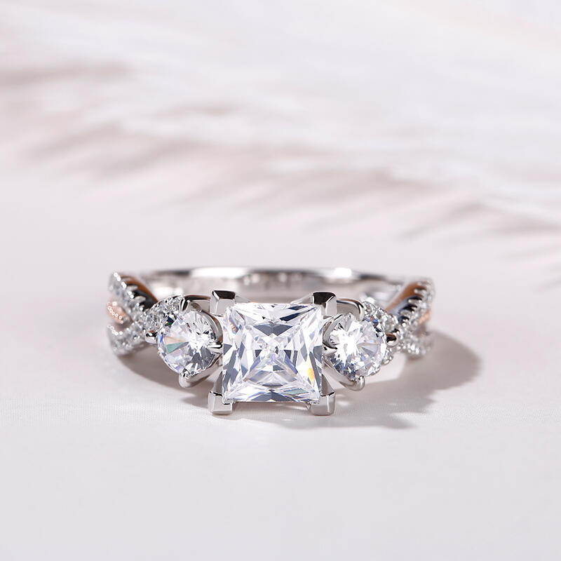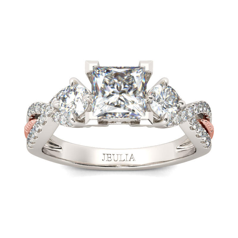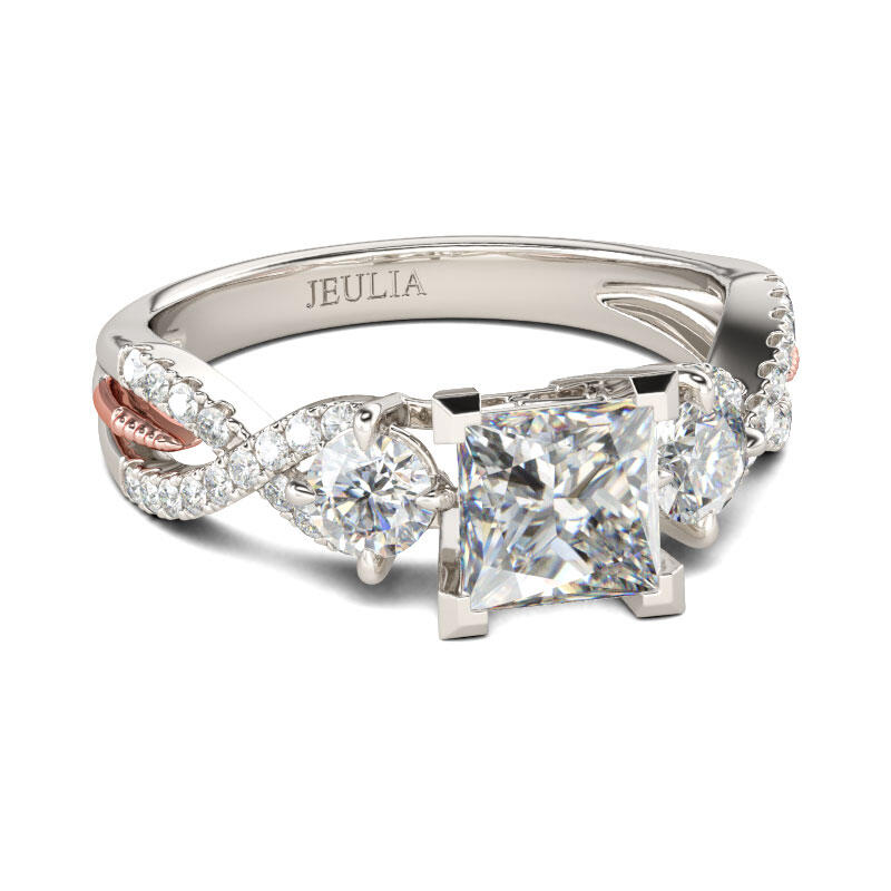 An exquisite symbol of the blending of your two lives, this ring shines as brightly as your future. Three stone rings' meaning tells a story. The three main stones featured on these rings symbolize a couple's past, present, and future. While every ring is imbued with its own special meaning, this beautiful representation makes three stone rings an especially romantic choice. Crafted in two tone sterling silver, this ring features two ribbons that twist and twine together, leading up to the princess-cut center stone. With all the shimmering stones, this ring is a beautiful beginning to your lasting love story.