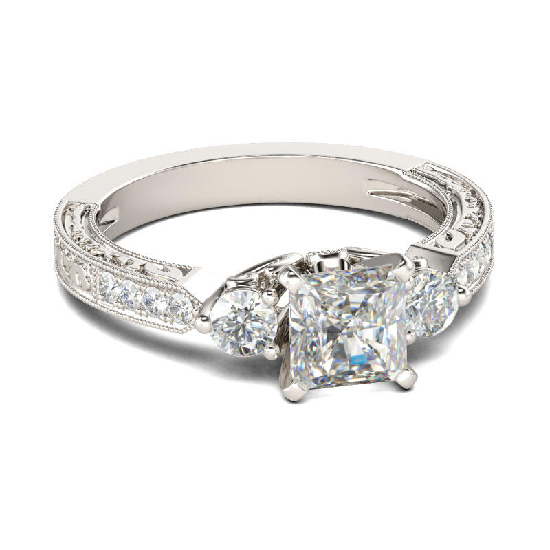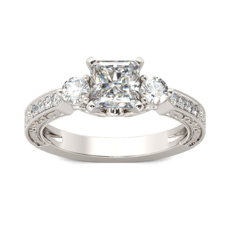 Graceful and glamorous, this ring delivers eye-catching style. Crafted in sterling silver, this dazzling choice showcases a shimmering princess cut center stone flanked by two round stones, while additional stones sparkle on ring's shank, creating a dazzling look from any angle.Treat yourself or beloved her to this stunning ring that celebrates endless love and passion.