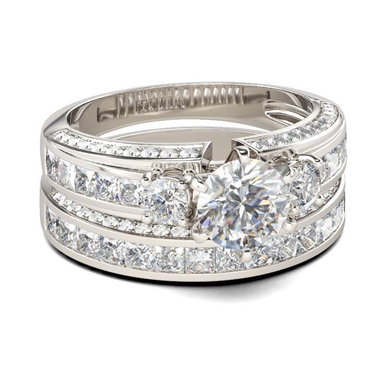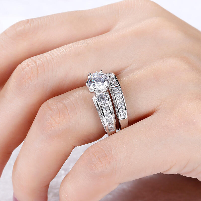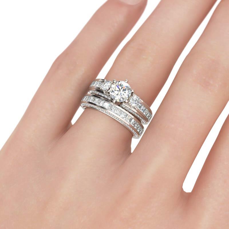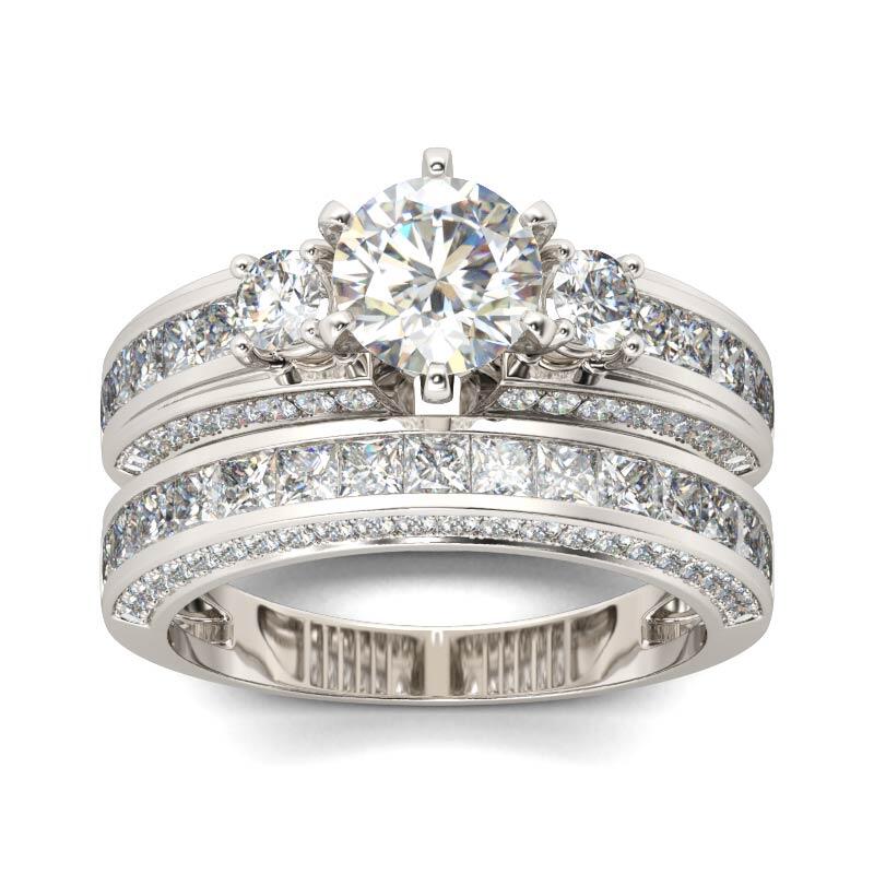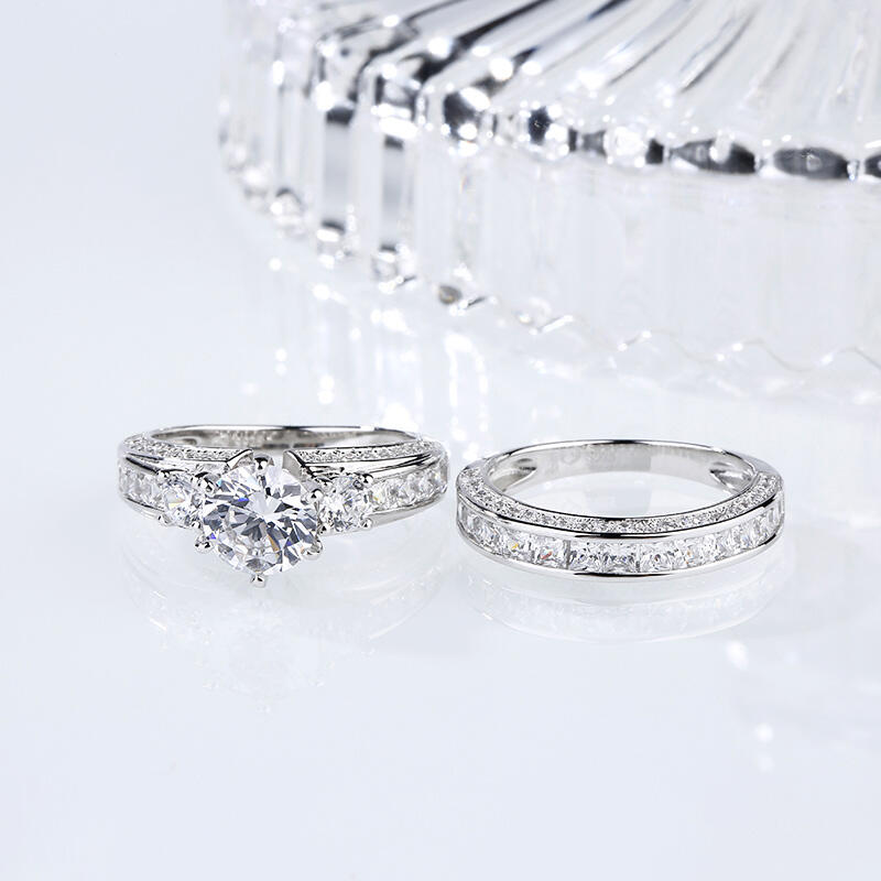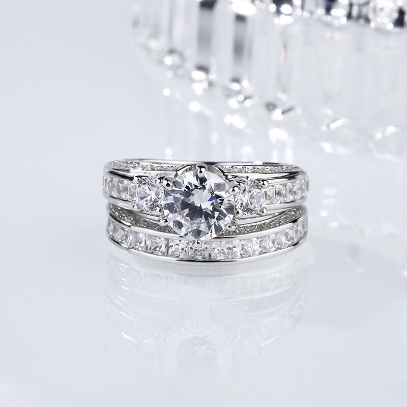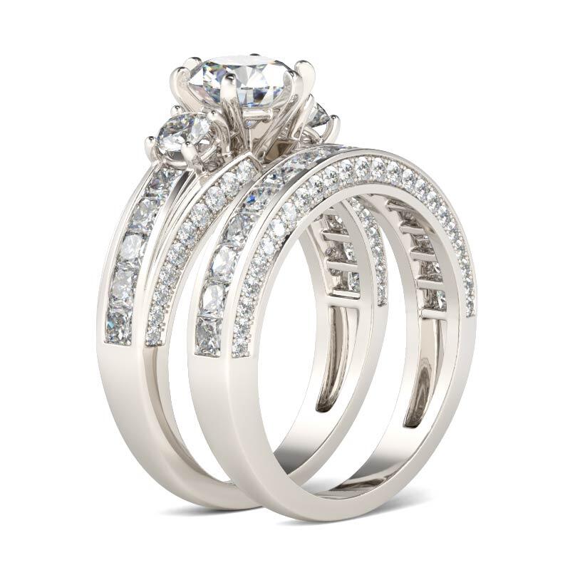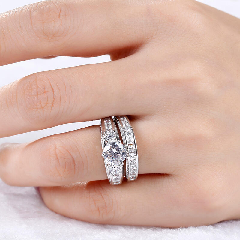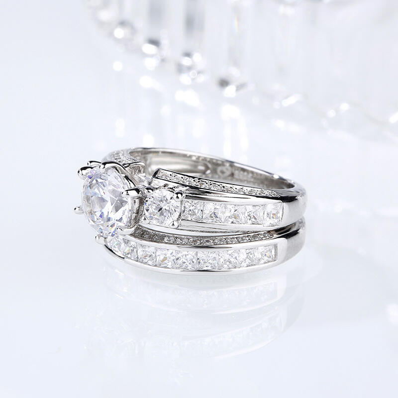 Classic and luxurious, this three-stone ring set will capture your heart at first sight. Three stone rings' meaning tells a story. The three main stones featured on these rings symbolize a couple's past, present, and future. While every ring is imbued with its own special meaning, this beautiful representation makes three stone rings an especially romantic choice. This three-stone ring set showcases a sparkling look with its three-side paved stones. Take the ring set without any hesitation, and it won't disappoint you!