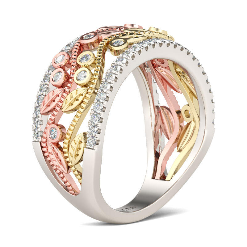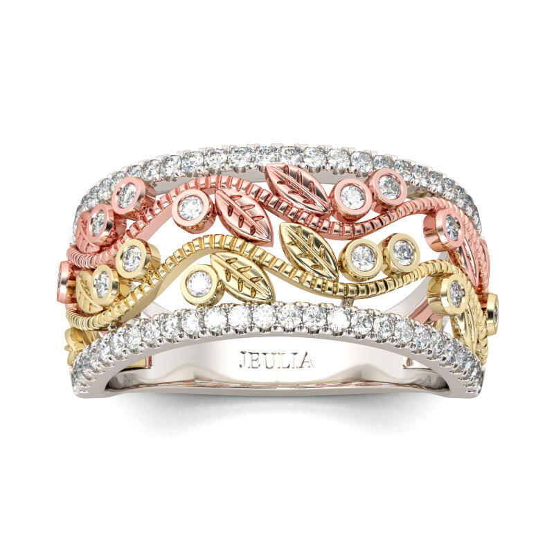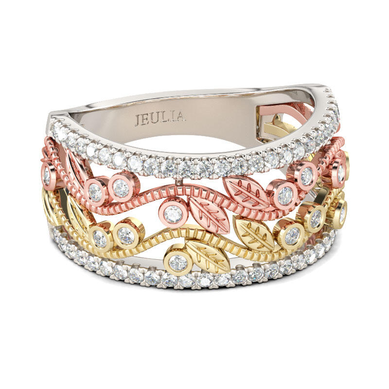 Jeulia Tri-Tone Leaf Round Cut Sterling Silver Women's Band