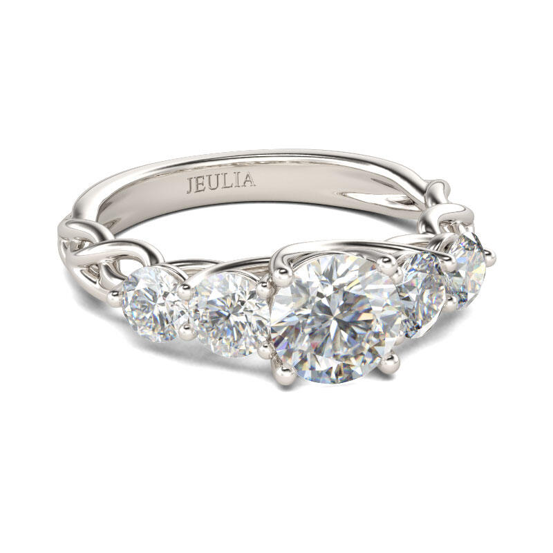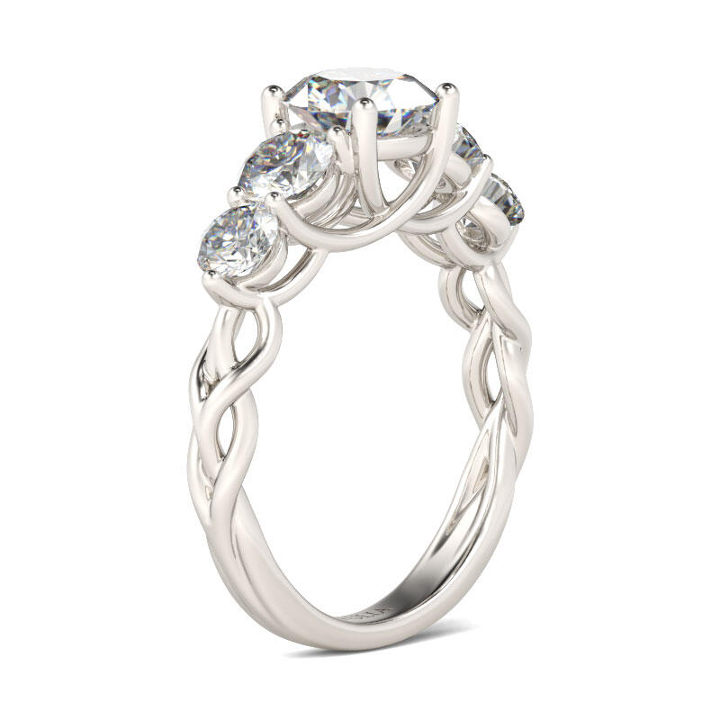 What does it mean to fall in love? It means you have found the one that makes your heart melting. You will join your lives together forever and pledge to always be there for each other. This ring is the perfect symbolic embodiment of your romantic love story. Five sparkling round cut stones shimmer at the center of twisting shank, making this ring an eye-catcher everywhere. This elegant and timeless look blends sophistication with radiance and sparkle.