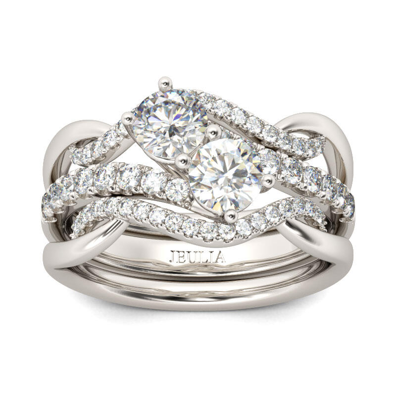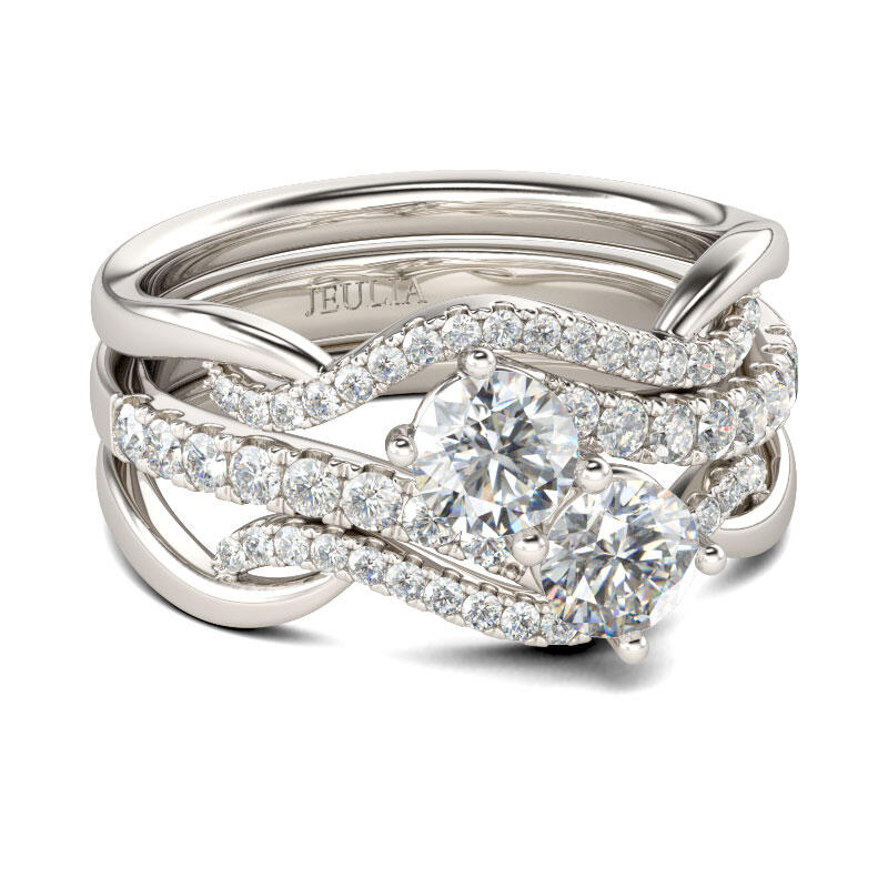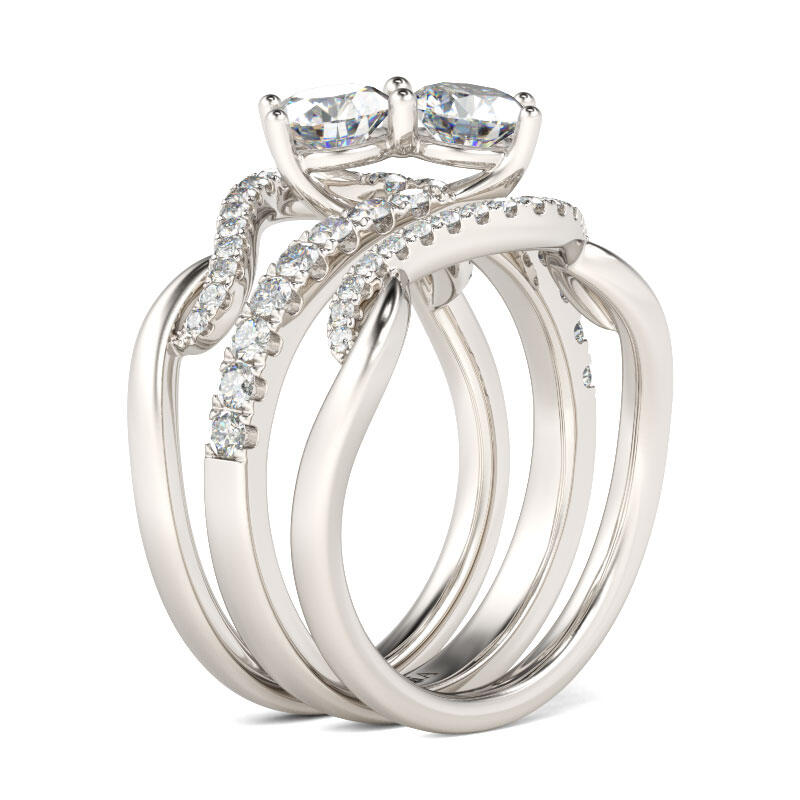 Beautifully crafted in sterling silver, bypassing lined ribbons lined with shimmering stones embrace two larger stones set cleverly on the diagonal at the center of the style. The matching wedding bands are lined with additional round stones for a gorgeous effect.