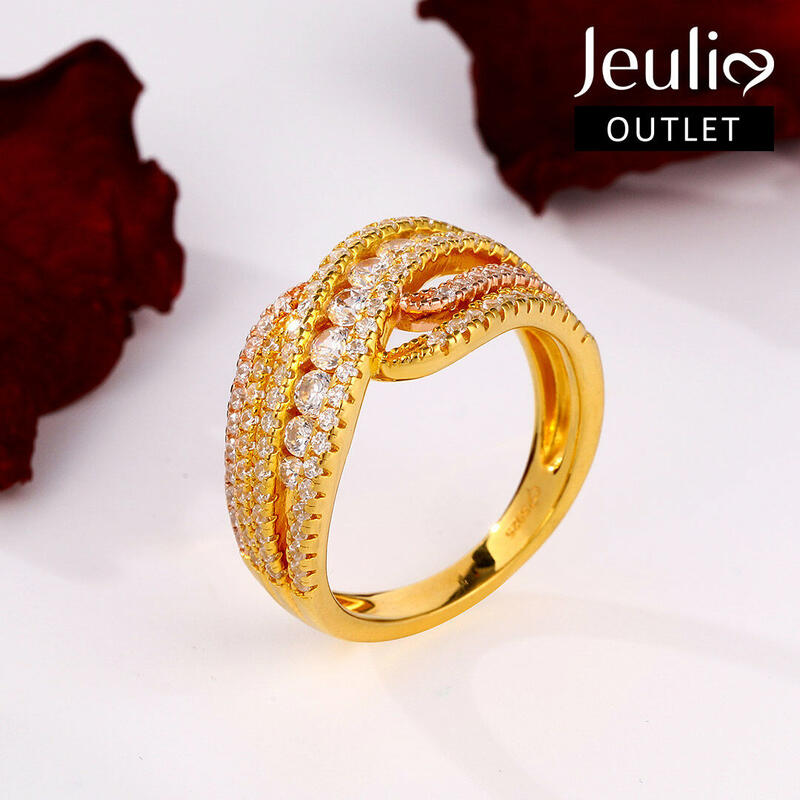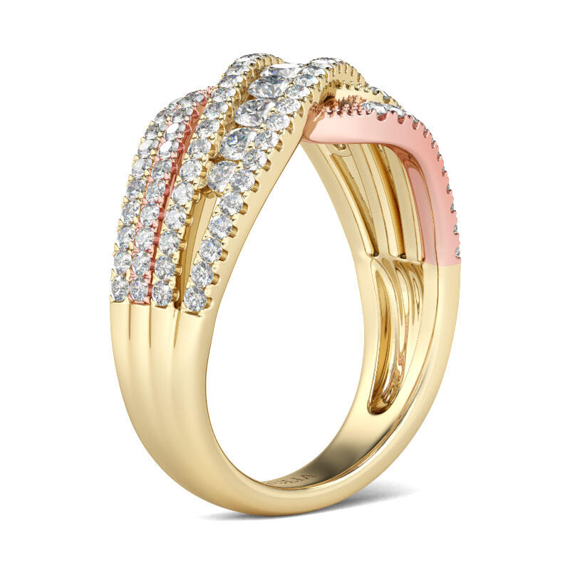This perfect twisted band will be an eye catcher on your finger. With nine big round side stones in the middle,the band sparkles resplendently in any angle. The two tone design makes it more stylish.