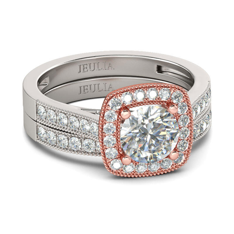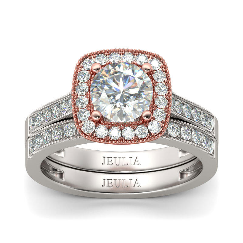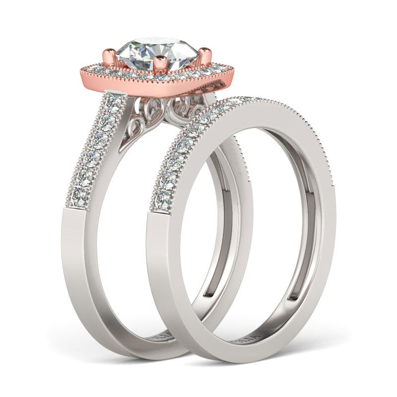 Ask for her hand with the elegant ring, and seal your commitment with an equally beautiful wedding band. Crafted in sterling silver, this beautiful design showcases a round cut center stone wrapped in a glistening halo frame, bringing out its beauty and sparkle. Additional stones glisten on the shank as well as the wedding band. Glamorous and classic, this exceptional bridal set will forever express your eternal love and undying commitment.