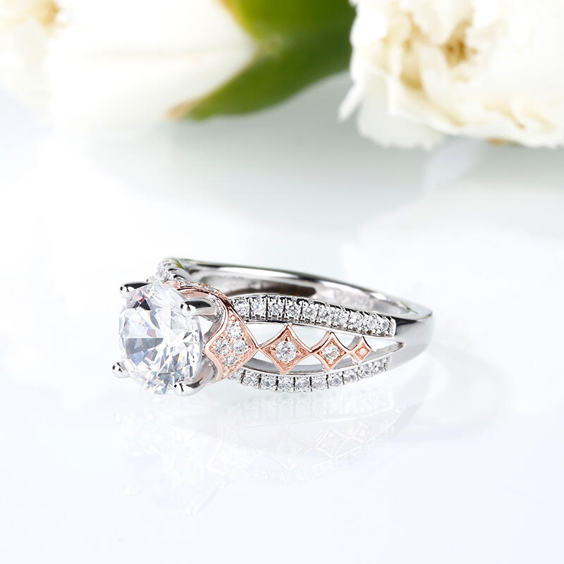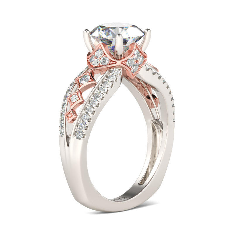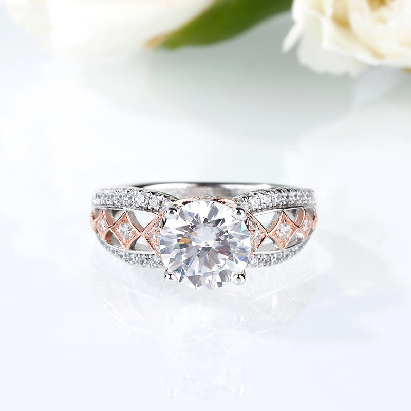 Unique and sparkling, this ring will capture your heart at first sight. Crafted in two tone sterling silver, the ring is sculptured in a cut-out vintage-style shank. A round cut center stone is set on the unique mount. With all the sparkling tone, the ring will certain to show a sparkling look on your finger. Treat yourself or delight her with this masterpiece.