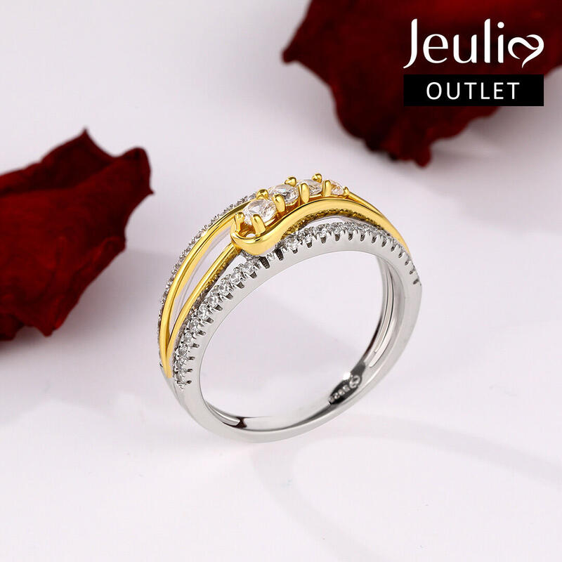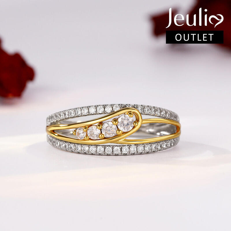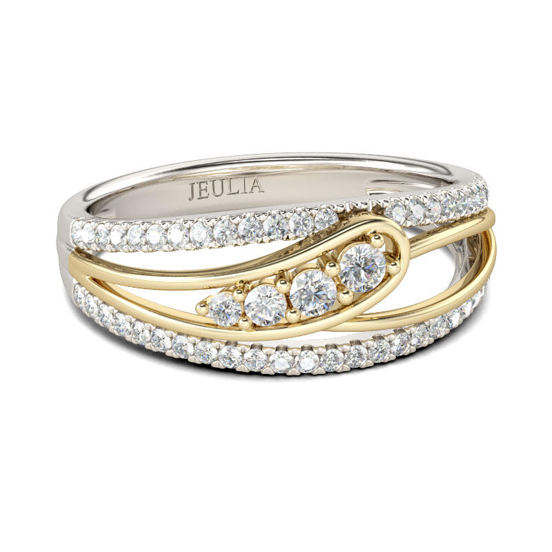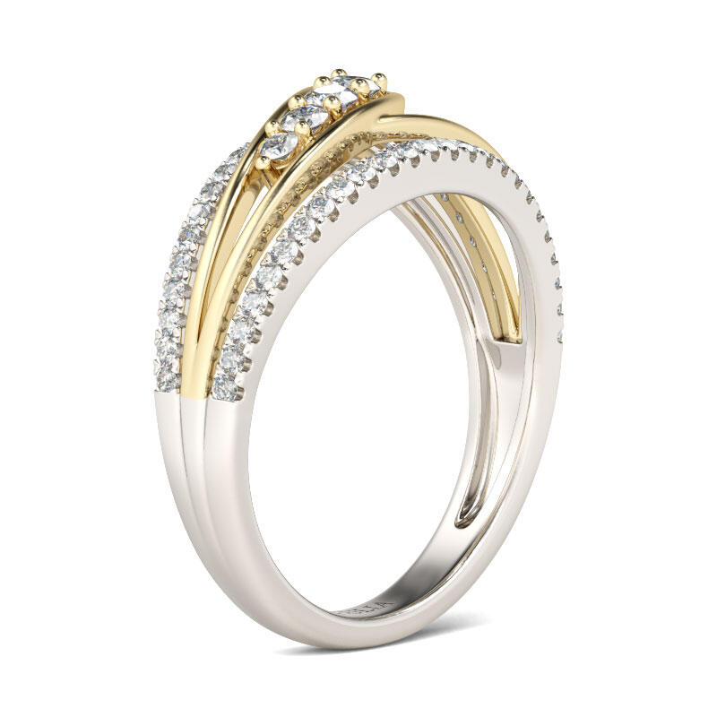 Delicate and sparkling, this band will draw your eyes at first sight. Crafted in two tone sterling silver, this bypass design band features two intertwined gold tone ribbons in the middle of the shank. Glistening round stones are set in the center to complement the design. The split shank is paved with round stones, showing a sparkling look from every angle. Celebrate your years together with this chic anniversary band or treat yourself a holiday gift with this little lovely piece.