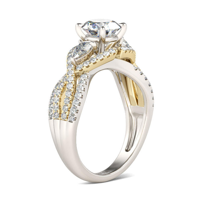 Dainty and delicate, this ring will capture your heart at first sight. Crafted in two tone sterling silver, this ring features a three-stone frame at the center on a intertwined shank. Along the shank, shimmering round stones are set on it to add extra sparkle to the ring. Treat yourself or delight her with this stunning piece.