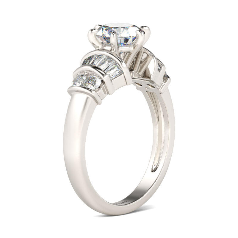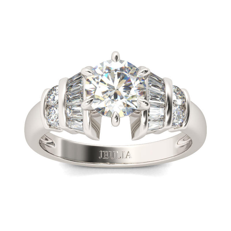 Sparkling and delicate, crafted in sterling silver, this ring features a fan-shaped baguette accents on the shank and a 7mm round center stone set on a six-prong mount. The unique look has attracted many ladies. With the different stones on the ring, it will sparkles perfectly from every angle. Treat yourself a holiday gift with this lovely piece.