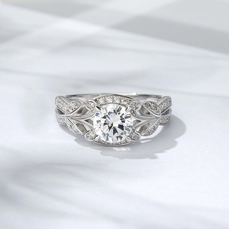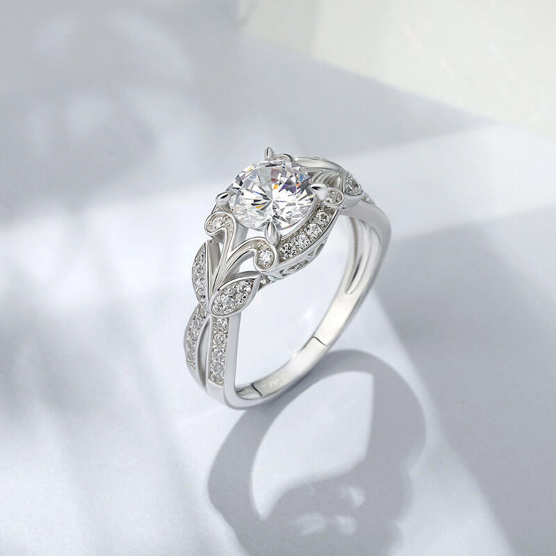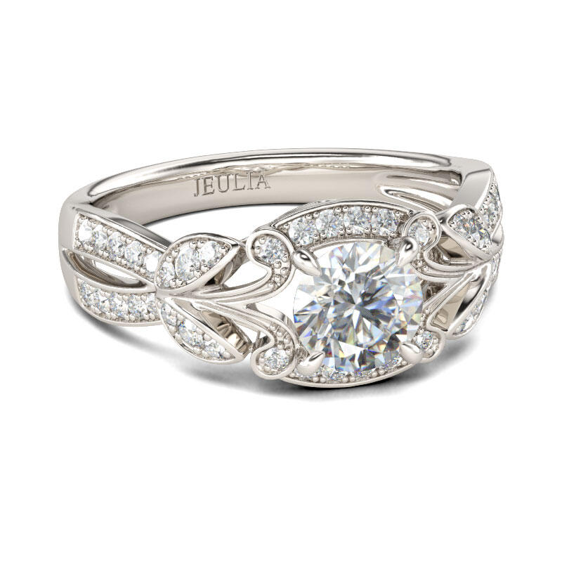 Jeulia Vintage Leaf Design Round Cut Sterling Silver Ring