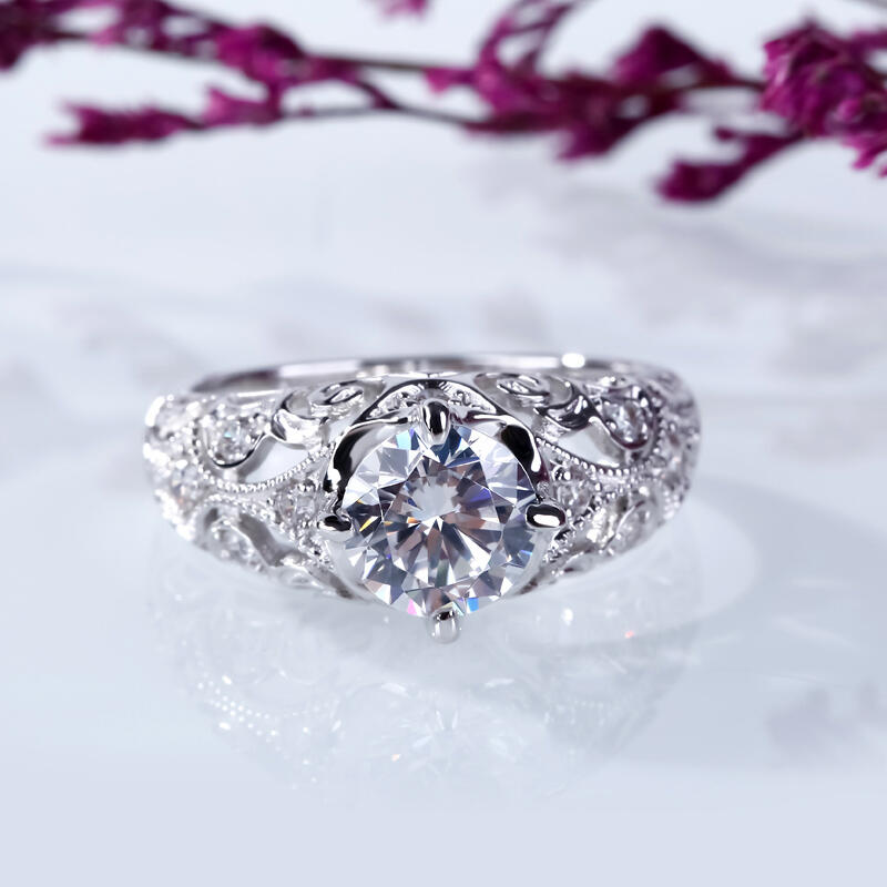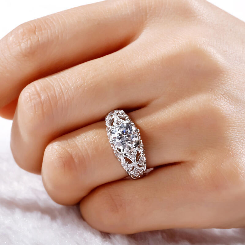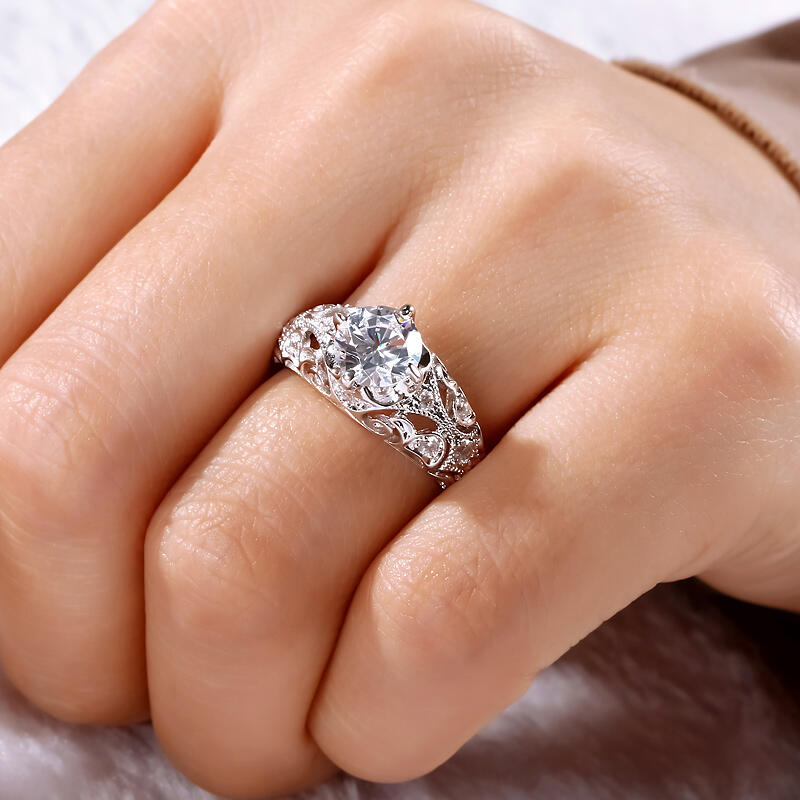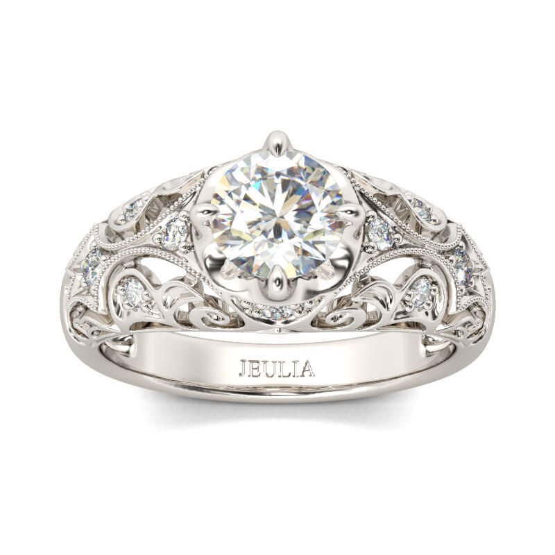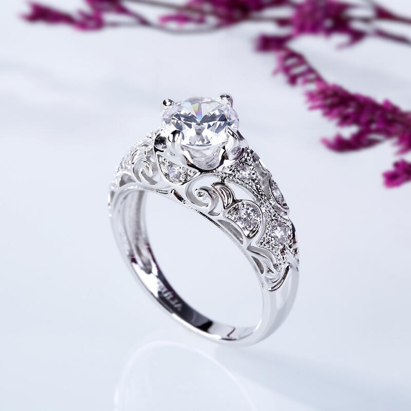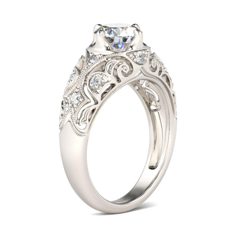 This stunning engagement ring will capture your heart at first sight. Crafted in sterling silver, this vintage ring features its a 7mm round cut center stone set on a unique mount and its vintage-style cut-out shank. The delicate shank is set with glistening round stones and adorned with milgrain, adding extra sparkle to the ring. It is a nice choice for fans of vintage ring. Just add this unique and beautiful piece to your jewelry box.