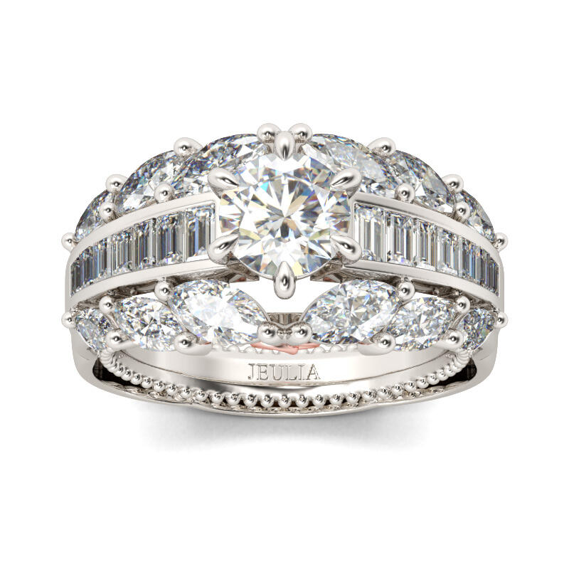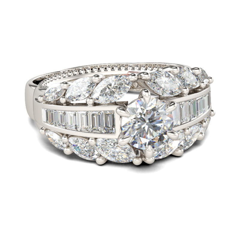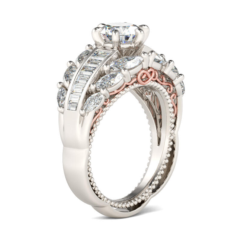 Stunning and sparkling, this ring will capture your heart at first sight. Crafted in two tone sterling silver, the engagement ring features a six-prong round-cut center stone on a glistening shank. Along the shank, three rows of emerald-cut and marquise-cut stones are set to complement the design and add sparkle to the ring. Treat yourself or surprise her with this piece this holiday.
