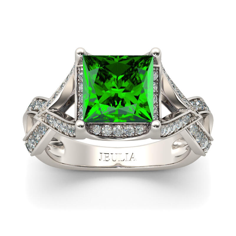 Showcasing timeless, enduring beauty, this ring will take her breath away. Expertly crafted in sterling silver, the eye is drawn to the 8mm emerald green center stone. A hidden halo frame of shimmering accent stones surrounds the center stone, while additional round stones line the ring's intertwined shank. Treat yourself or loved ones with this ring. It's time to update your jewelrybox with this charming ring.