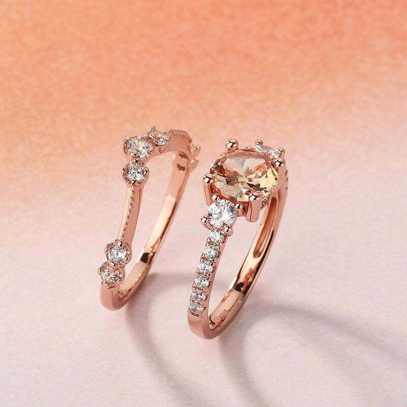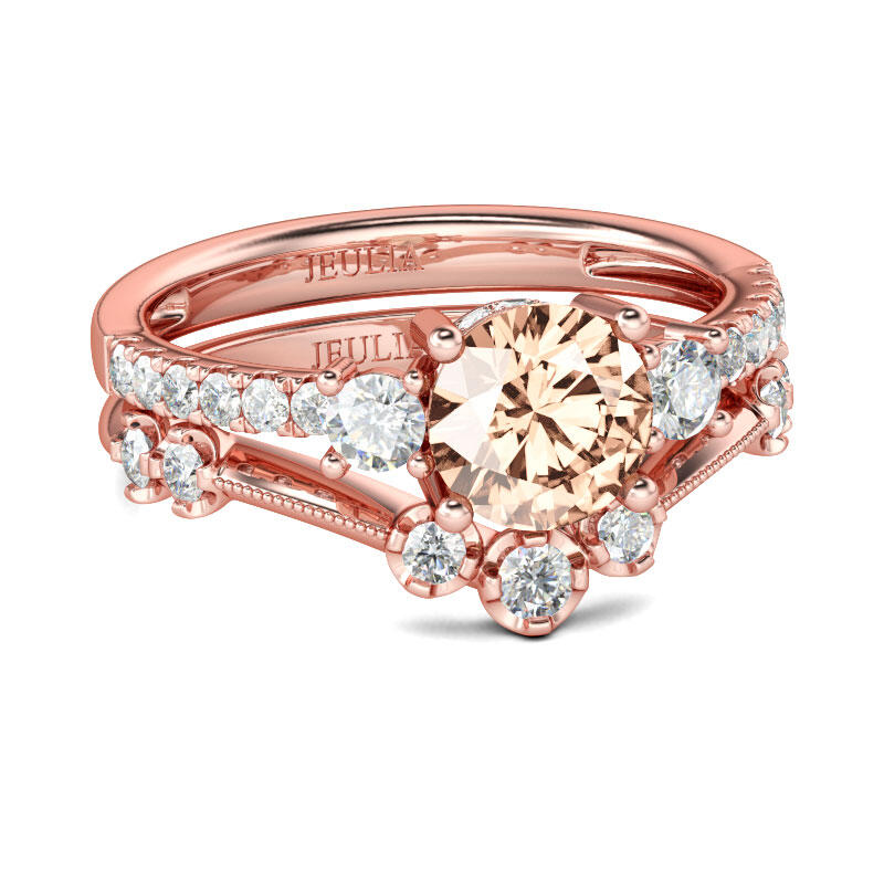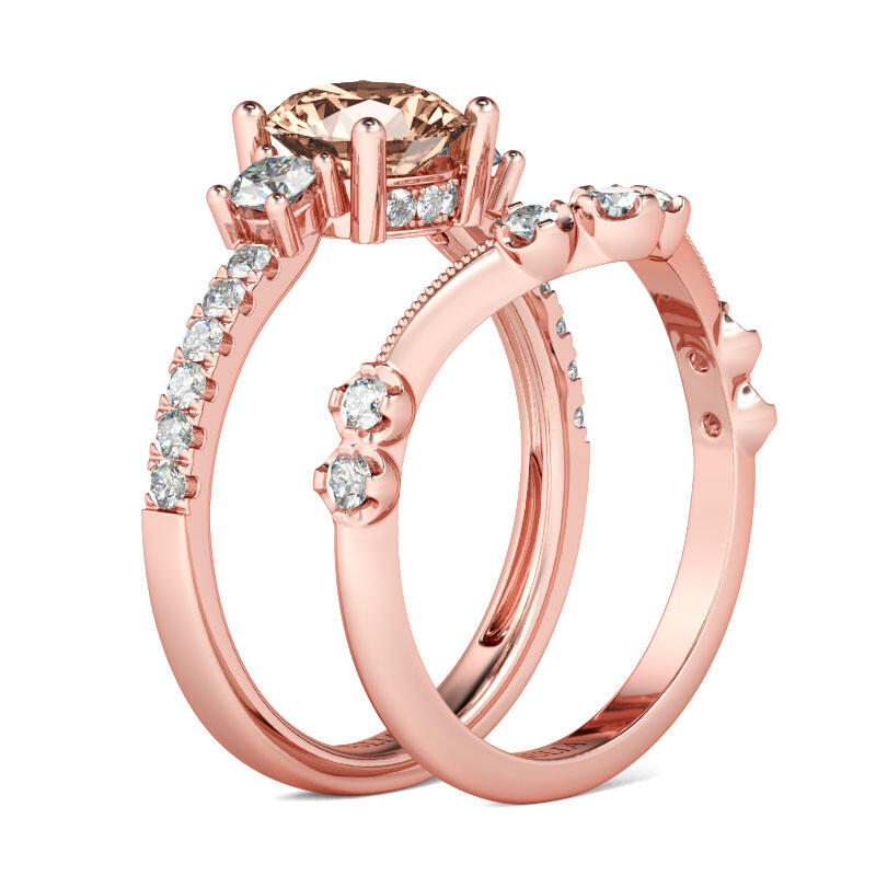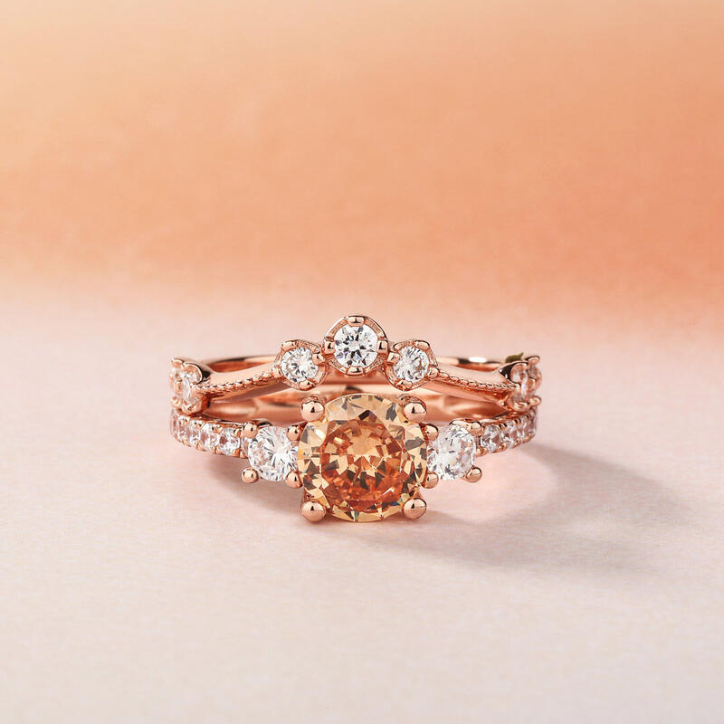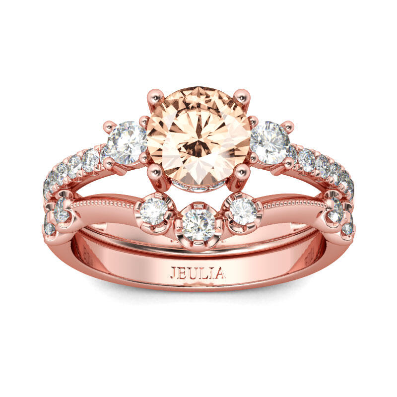 Jeulia Rose Tone Three-stone Round Cut Sterling Silver Ring Set
