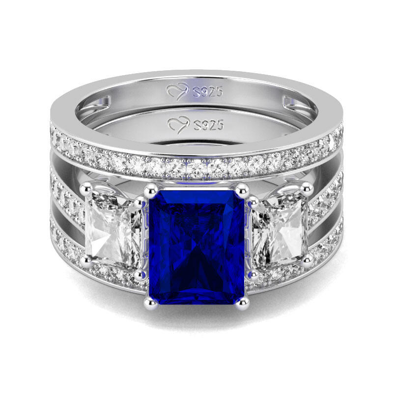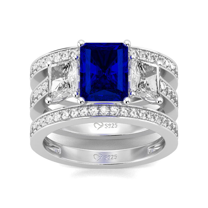 Reflect all the love in your heart with this enchanting three piece wedding set. Crafted in sterling silver, this design features three sparkling radiant cut stones artfully set to enhance size and sparkle, while additional stones line the shank and matching bands. All the stones sparkle perfectly from every angle,making the ring an eye-catcher everywhere.