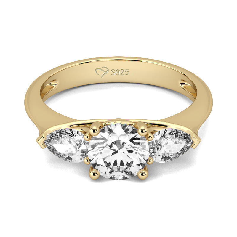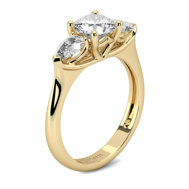 Speak words of love and devotion as your present her with this gleaming three-stone engagement ring.Glittering in bold brilliance, this elegant design showcases a sparkling round cut stone at the center, while two pear cut stones flank the center stone for extra shimmer. All stones shine brightly enough to be deserving as a symbol of your love.