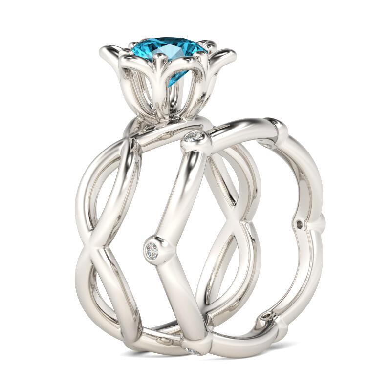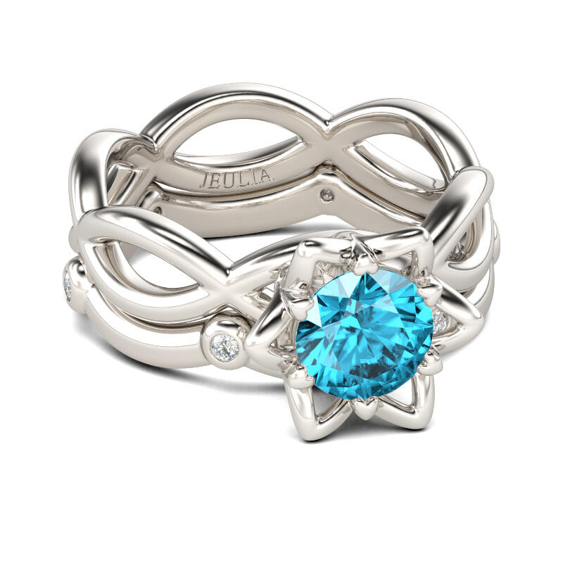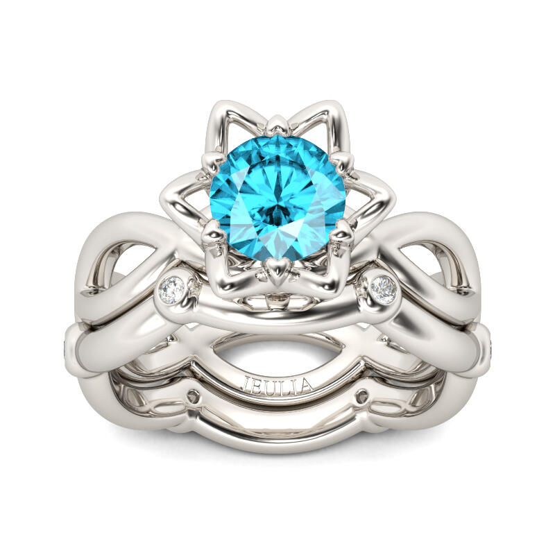 Jeulia Twist Aquamarine Round Cut Flower Sterling Silver Ring Set