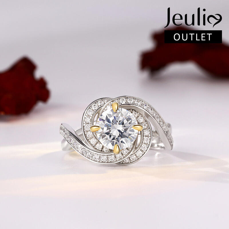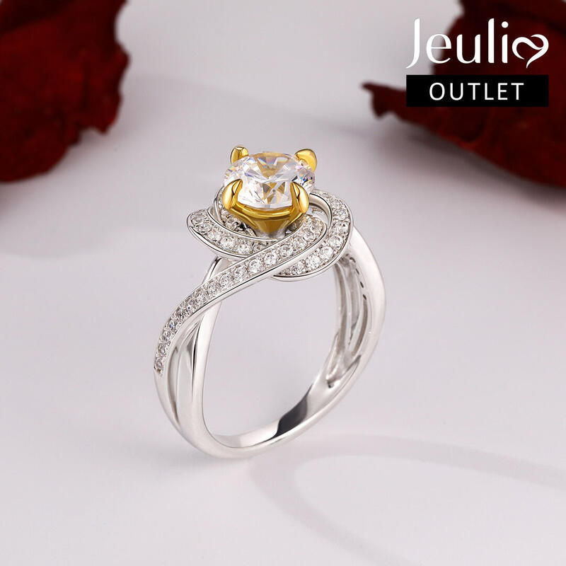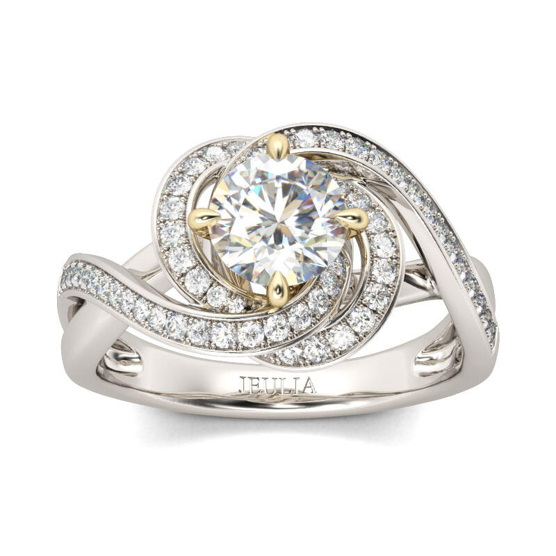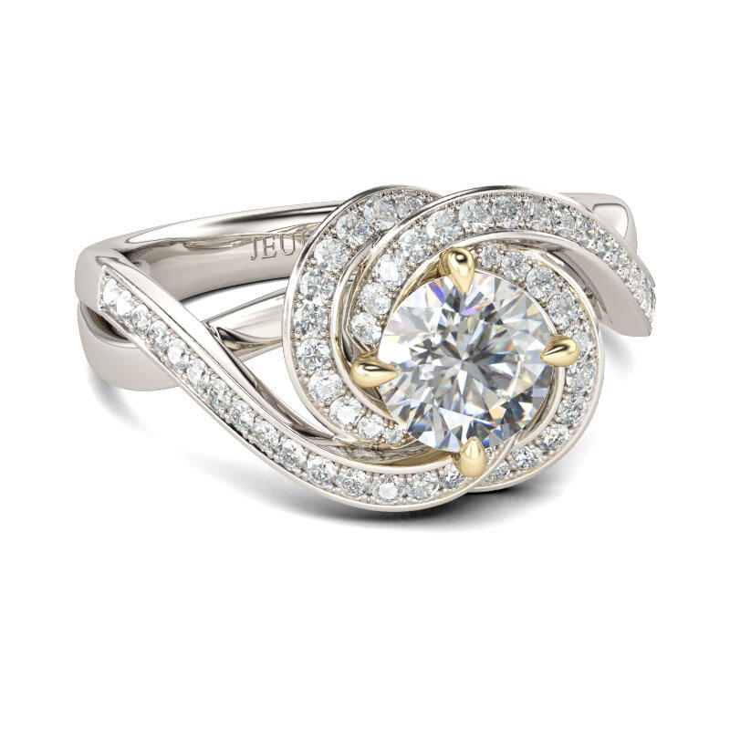 This stunning engagement ring will leave you speechless at first sight. Crafted in two tone sterling silver, this beauty showcases a 7mm round-cut center stone wrapped in a twisting halo of glistening round stones. The floral-like halo high-like the center stone and add spark to the ring. With the beautiful twisting shank, the ring will show an elegant and unique look on your finger. Treat yourself or surprise her with this beautiful flower ring.