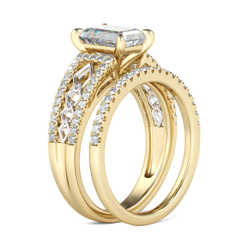 Stunning and sparkling, this ring set will capture your heart at first sight. Crafted in two tone sterling silver, the engagement ring features an emerald-cut center stone set on a cut-out split shank. Rhombus frames adorn the split shank. With the glistening coordinating band,the ring set will show an exquisite and dazzling look from every angle on your finger. Treat yourself or surprise her with this stunning piece.