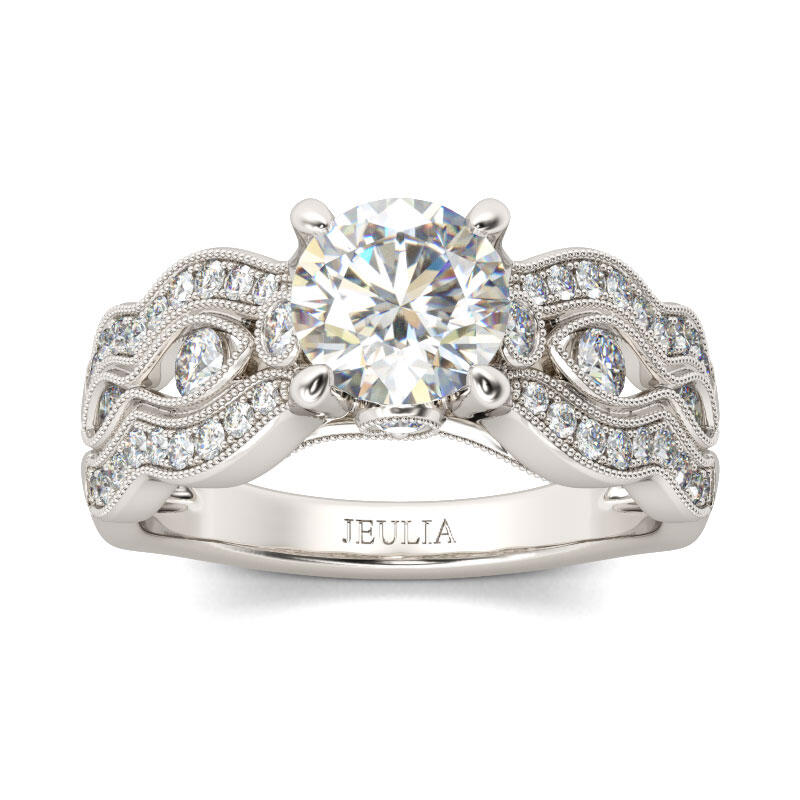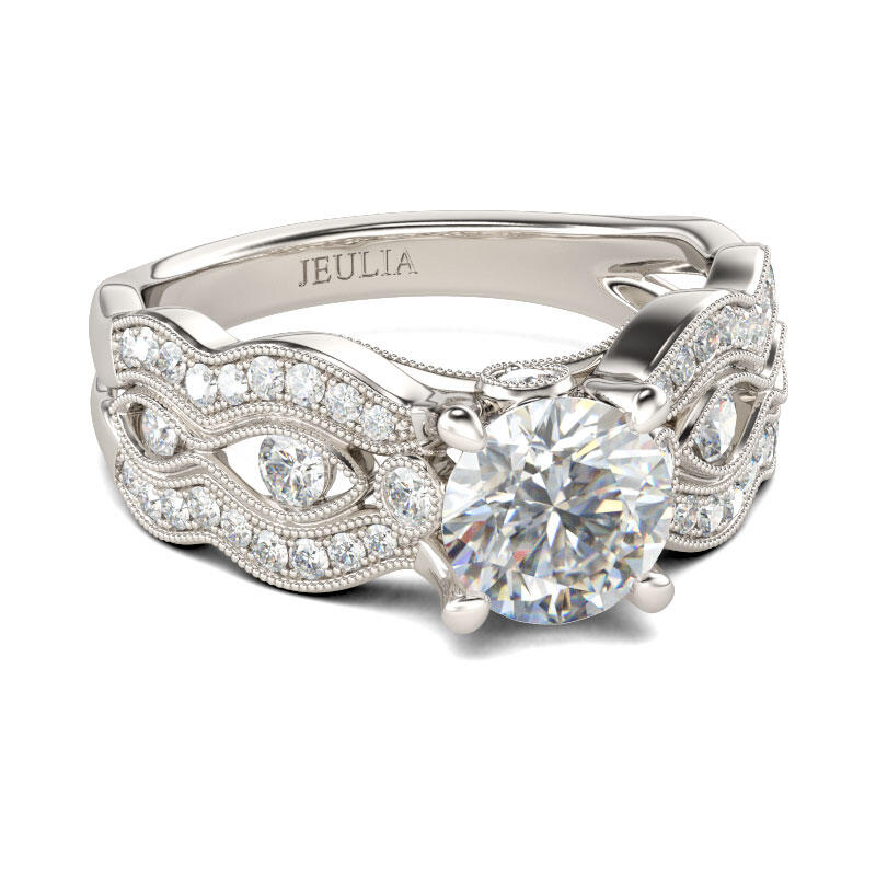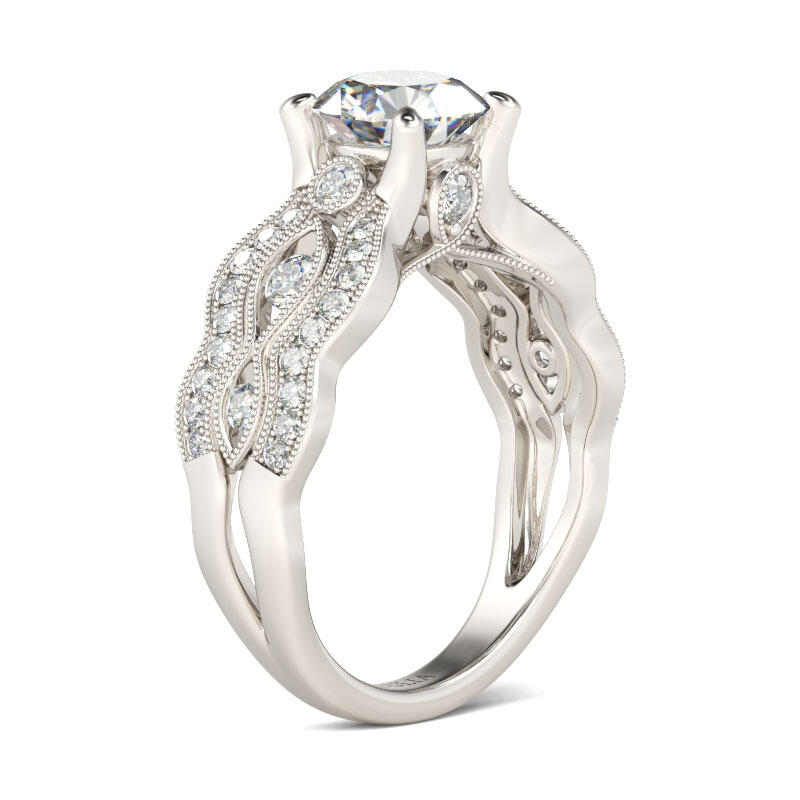 Treat yourself or surprise her with this sumptuous engagement ring. Crafted in sterling silver, this brilliant design showcases a sparkling round-cut center stone set on a vintage-inspired shank. Along the beautifully decorated shank, round stones are lined with intricate twisting milgrain detailing and shimmering ribbons. With all the stones, the ring sparkles crazily from every angle. Never miss it!